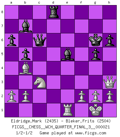 Last move : 1/2-1/2 2019 September 4 10:44:6 [Event "FICGS__CHESS__WCH_QUARTER_FINAL_3__000021"] [Site "FICGS"] [Date "2019.07.01"] [Round "8"] [White "Eldridge,Mark"] [Black "Bleker,Frits"] [Result "1/2-1/2"] [WhiteElo "2435"] [BlackElo "2504"] 1.Nf3 d5 2.d4 Nf6 3.c4 c6 4.Nc3 e6 5.Bg5 h6 6.Bh4 dxc4 7.e4 g5 8.Bg3 b5 9.Be2 Bb7 10.O-O Nbd7 11.Ne5 Bg7 12.Nxd7 Nxd7 13.Bd6 a6 14.e5 c5 15.d5 Nxe5 16.dxe6 Nd3 17.exf7+ Kxf7 18.Bxd3 cxd3 19.Qxd3 Qf6 20.Qg3 Rhe8 21.Bxc5 Qc6 22.Rad1 Rad8 23.Bb4 Be5 24.Qh3 Kg6 25.Rxd8 Rxd8 26.Re1 Bc8 27.Qe3 Bb7 28.Qh3 1/2-1/2 Reti Opening Kingside Castling by player White (move 10) This chess game ended in a draw. Follow this game move after move (download)My God, Bobby Fischer plays so simply. (Alexei Suetin) Ich glaube, ich kenne inzwischen die Gründe für mein Versagen: schachliche Charakterfehler. Ich war nie ein Wunderkind und in meiner gesamten menschlichen Entwicklung immer zu langsam. (Viktor Kortschnoi) Fischer sacrificó virtualmente todo lo que la mayoría de nosotros los 'debiles' (término que él usa) valoramos, respetamos y apreciamos por el amor de un astuto, a menudo hermoso tablero de juego, por el privilegio ambivalente de ser su mas grande maestro. (Paul Kollar) Seul un grand joueur sait à quel point il joue faiblement. (Xavier Tartacover) A specialist learns more and more about less and less until he knows everything about nothing. (Nicholas Murray Butler)