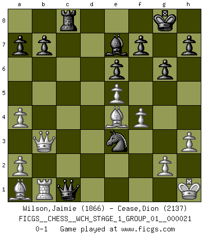 Last move : 0-1 2019 October 10 21:30:50 [Event "FICGS__CHESS__WCH_STAGE_1_GROUP_01__000021"] [Site "FICGS"] [Date "2019.07.01"] [Round "1"] [White "Wilson,Jaimie"] [Black "Cease,Dion"] [Result "0-1"] [WhiteElo "1866"] [BlackElo "2137"] 1.c4 e6 2.Nf3 Nf6 3.Nc3 c5 4.d4 cxd4 5.Nxd4 d5 6.cxd5 Nxd5 7.Bd2 Be7 8.e4 Nxc3 9.Bxc3 O-O 10.Be2 Qb6 11.O-O Bf6 12.f4 Rd8 13.e5 Be7 14.Kh1 Bc5 15.Qa4 Bd7 16.Qc4 Nc6 17.Rad1 Rac8 18.Bf3 Na5 19.Qd3 Ba4 20.b3 Nc6 21.bxa4 Nxd4 22.Be4 Nf5 23.Qh3 Rxd1 24.Rxd1 Be7 25.Ba1 g6 26.Qb3 Ne3 27.Rb1 Qc5 28.h3 Qc1+ 0-1 English Opening Kingside Castling by player Black (move 9) Kingside Castling by player White (move 11) Player Black won this chess game. Follow this game move after move (download)All I want to do, ever, is just play Chess. (Bobby Fischer) Ohne ihre Erfolge schmälern zu wollen würde ich sagen Petrosian, Spassky und Karpov verdanken ihre Siege ihren Trainern - Boleslavsky, Bondarevsky und Furman. (Mikhail Moiseyevich Botvinik) Del Ajedrez se ha dicho que la vida no es lo suficientemente larga para él, pero eso es culpa de la vida, no del Ajedrez. (William Ewart Napier) Aidez vos pièces, elles vous aideront. (Paul Morphy) It is a good thing for an uneducated man to read books of quotations. (Winston Churchill)