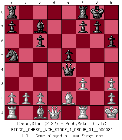 Last move : 1-0 2019 September 19 19:23:31 [Event "FICGS__CHESS__WCH_STAGE_1_GROUP_01__000021"] [Site "FICGS"] [Date "2019.07.01"] [Round "1"] [White "Cease,Dion"] [Black "Pech,Matej"] [Result "1-0"] [WhiteElo "2137"] [BlackElo "1747"] 1.e4 e5 2.Nf3 Nc6 3.Bc4 Nf6 4.Ng5 d5 5.exd5 Na5 6.Bb5+ c6 7.dxc6 bxc6 8.Be2 h6 9.Nh3 Bd6 10.d3 O-O 11.O-O Bc7 12.Nc3 Bxh3 13.gxh3 Qd6 14.Ne4 Nxe4 15.dxe4 Qg6+ 16.Kh1 Qxe4+ 17.f3 1-0 Two knights defense Kingside Castling by player Black (move 10) Kingside Castling by player White (move 11) Player White won this chess game. Follow this game move after move (download)Human affairs are like a Chess game: only those who do not take it seriously can be called good players. (Hung Tzu Ch'eng) Ein Isolani verdüstert die Stimmung auf dem ganzen Schachbrett. (Savielly Grigorievitsch Tartakower) Una clavada es mas poderosa que una espada. (Fred Reinfeld) Les pièces de l'échiquier étaient impitoyables. Elles le retenaient, elles l'absorbaient. Il y avait de l'horreur en cela, mais aussi une harmonie unique. Car, qu'y a-t-il dans le monde, à part les échecs ? (V. Nabokov) Creativity is allowing yourself to make mistakes. Art is knowing which ones to keep. (Scott Adams)
