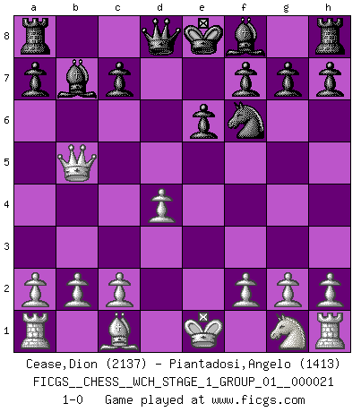 Last move : 1-0 2019 July 24 20:53:45 [Event "FICGS__CHESS__WCH_STAGE_1_GROUP_01__000021"] [Site "FICGS"] [Date "2019.07.01"] [Round "1"] [White "Cease,Dion"] [Black "Piantadosi,Angelo"] [Result "1-0"] [WhiteElo "2137"] [BlackElo "1413"] 1.e4 e6 2.d4 d5 3.Nc3 dxe4 4.Nxe4 Nd7 5.Bd3 Ngf6 6.Qe2 Nxe4 7.Bxe4 Nf6 8.Bxb7 Bxb7 9.Qb5+ 1-0 French : Rubinstein variation Player White won this chess game. Follow this game move after move (download)A man that will take back a move at Chess will pick a pocket. (Richard Fenton) Die Leute spielen gegen mich seit 15 Jahren unter Ihren Möglichkeiten. (Robert James Fischer) El Ajedrez es una guerra en un tablero. El objetivo es aplastar la mente del oponente. (Bobby Fischer) Vous m'avez demandé de vous exposer quel est le fondement de la prière. Je ne fais que préparer les pièces du jeu sur la table... Nous sera-t-il permis d'en adopter les règles et si nous les appliquons scrupuleusement nous ne tarderons pas à faire mat le Roi divin ! Il ne pourra échapper à nos mains. (Sainte Thérèse d'Avila, Chemin de perfection) If passion drives you, let reason holds the reins. (Benjamin Franklin)