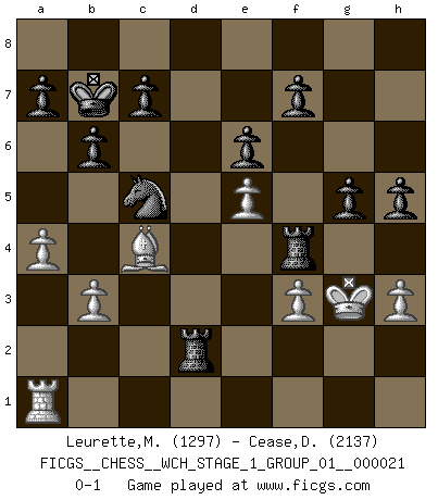 Last move : 0-1 2019 September 10 9:48:7 [Event "FICGS__CHESS__WCH_STAGE_1_GROUP_01__000021"] [Site "FICGS"] [Date "2019.07.01"] [Round "1"] [White "Leurette,Marc-Antoine"] [Black "Cease,Dion"] [Result "0-1"] [WhiteElo "1297"] [BlackElo "2137"] 1.e4 Nf6 2.e5 Nd5 3.d4 d6 4.Nf3 g6 5.c4 Nb6 6.c5 dxc5 7.dxc5 Qxd1+ 8.Kxd1 Nd5 9.Bc4 e6 10.Nbd2 Bxc5 11.Ne4 Be7 12.Bd2 Nd7 13.Ke2 b6 14.Rhd1 Bb7 15.Bh6 Bf8 16.Bxf8 Rxf8 17.Rac1 Nf4+ 18.Kf1 Bxe4 19.Rd4 Bxf3 20.Rxf4 Bb7 21.Re1 O-O-O 22.a4 Nc5 23.b3 Bd5 24.Rb1 g5 25.Rd4 Bxg2+ 26.Kxg2 Rxd4 27.Re1 Rfd8 28.h3 Kb7 29.Kg3 Rf4 30.f3 Rd2 31.Ra1 h5 0-1 Alekhine's defense : Modern, Fianchetto variation Queenside Castling by player Black (move 21) Player Black won this chess game. Follow this game move after move (download)There just isn't enough televised Chess. (David Letterman) Im Wettkampf zwischen starken Meistern kommen Fehler sehr selten vor, deshalb ist es mit bloßem Warten nicht getan. (José Raúl Capablanca) Con el tiempo, empecé a progresar en partidas decisivas. Tal vez porque me di cuenta de una simple verdad: no solo estaba yo nervioso sino también mi oponente. (Mikhail Tal) Des points faibles ou des trous dans la position de l'adversaire doivent être occupés par des pièces et non pas par des pions. (Siegbert Tarrasch) The difference between stupidity and genius is that genius has its limits. (Murphy)