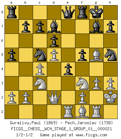 Last move : 1/2-1/2 2019 September 6 10:23:44 [Event "FICGS__CHESS__WCH_STAGE_1_GROUP_01__000021"] [Site "FICGS"] [Date "2019.07.01"] [Round "1"] [White "Guralivu,Paul"] [Black "Pech,Jaroslav"] [Result "1/2-1/2"] [WhiteElo "1869"] [BlackElo "1738"] 1.d4 Nf6 2.c4 g6 3.Nc3 Bg7 4.e4 d6 5.Nf3 O-O 6.h3 e5 7.d5 Nh5 8.g3 a5 9.Bg2 Na6 10.O-O Bd7 11.Bg5 Qc8 12.Kh2 Qe8 13.Qd2 f5 14.exf5 gxf5 15.Rae1 e4 16.Rg1 Nc5 17.Bf1 1/2-1/2 King's Indian : 5.Nf3 Kingside Castling by player Black (move 5) Kingside Castling by player White (move 10) This chess game ended in a draw. Follow this game move after move (download)The essence of Chess is thinking about what Chess is. (David Bronstein) Dass jemand wie Surab Asmaiparaschwili, der selbst Elopunkte gekauft hat , Vize-Präsident der Fide werden konnte, sagt schon einges über den Zustand dieser Organisation aus. (Joel Lautier) Todo se encuentra en un estado de flujo y esto incluye al mundo del Ajedrez. (Mikhail Botvinnik) Aidez vos pièces, elles vous aideront. (Paul Morphy) Perfection is achieved, not when there is nothing more to add, but when there is nothing left to take away. (Antoine de Saint-Exupéry)