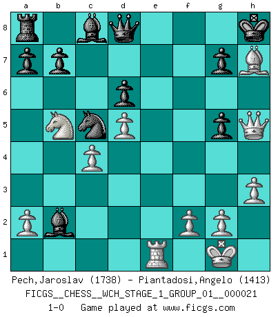 Last move : 1-0 2019 September 25 23:40:17 [Event "FICGS__CHESS__WCH_STAGE_1_GROUP_01__000021"] [Site "FICGS"] [Date "2019.07.01"] [Round "1"] [White "Pech,Jaroslav"] [Black "Piantadosi,Angelo"] [Result "1-0"] [WhiteElo "1738"] [BlackElo "1413"] 1.c4 e5 2.Nc3 Nf6 3.Nf3 d6 4.d4 Nc6 5.d5 Ne7 6.e4 Ng6 7.Be2 Be7 8.h3 O-O 9.O-O c6 10.Re1 Nf4 11.Bxf4 exf4 12.Qd2 Re8 13.Qxf4 cxd5 14.exd5 Nd7 15.Bd3 Nc5 16.Bc2 Bf6 17.Rxe8+ Qxe8 18.Re1 Qd8 19.Nb5 Bxb2 20.Ng5 f6 21.Bxh7+ Kh8 22.Qh4 fxg5 23.Qh5 1-0 English Opening Kingside Castling by player Black (move 8) Kingside Castling by player White (move 9) Player White won this chess game. Follow this game move after move (download)Checkers is for tramps. (Paul Morphy) Mutter, ich bin eben Ex-Weltmeister geworden. --beim nach Hause Kommen nach dem Verlust des WM-Titels an Mihail Botvinnik -- (Mikhail Nekhemyevich Tal) Hay dos clases de hombres: aquellos que se conforman en dejarse llevar por las circunstancias y que juegan barajas y aquellos decididos a controlar las circunstancias y que juegan al Ajedrez. (Mortimer Collins) Je ne crois pas en la psychologie, je crois aux bons coups. (Robert Fischer) I don't know, I don't care, and it doesn't make any difference. (Albert Einstein)