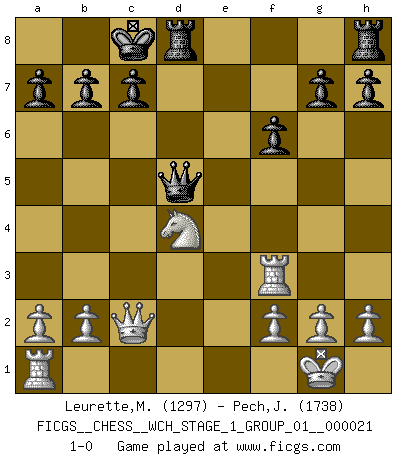 Last move : 1-0 2019 August 24 12:26:35 [Event "FICGS__CHESS__WCH_STAGE_1_GROUP_01__000021"] [Site "FICGS"] [Date "2019.07.01"] [Round "1"] [White "Leurette,Marc-Antoine"] [Black "Pech,Jaroslav"] [Result "1-0"] [WhiteElo "1297"] [BlackElo "1738"] 1.e4 e5 2.Nf3 Nc6 3.Bc4 Bc5 4.c3 Nf6 5.d4 exd4 6.cxd4 Bb4+ 7.Bd2 Bxd2+ 8.Nbxd2 d5 9.exd5 Nxd5 10.Bxd5 Qxd5 11.O-O Be6 12.Re1 O-O-O 13.Nb3 Bg4 14.Re3 f6 15.Qc2 Bxf3 16.Rxf3 Nxd4 17.Nxd4 1-0 Giuoco Piano Kingside Castling by player White (move 11) Queenside Castling by player Black (move 12) Player White won this chess game. Follow this game move after move (download)Becoming successful at Chess allows you to discover your own personality. That's what I want for the kids I teach. (Saudin Robovic) Intelligenz läßt sich nicht am Weg, sondern nur am Ergebnis feststellen. (Garry Kasparov) Cada Peón es potencialmente una Reina. (James Mason) Même si l'adversaire joue le coup analysé précédemment, recommencez l'analyse en voyant la nouvelle position. Première règle de Blumenfeld A good aphorism is too hard for the tooth of time, and is not worn away with the centuries, although it serves as food for every speech. (Friedrich Nietzsche)