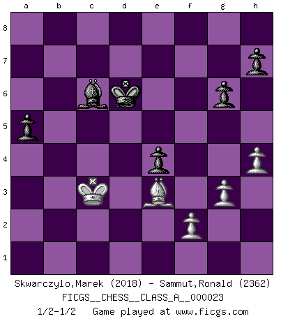 Last move : 1/2-1/2 2007 October 13 19:49:37 [Event "FICGS__CHESS__CLASS_A__000023"] [Site "FICGS"] [Date "2007.06.16"] [Round "1"] [White "Skwarczylo,Marek"] [Black "Sammut,Ronald"] [Result "1/2-1/2"] [WhiteElo "2018"] [BlackElo "2362"] 1.d4 Nf6 2.Nf3 g6 3.c4 Bg7 4.Nc3 d5 5.cxd5 Nxd5 6.e4 Nxc3 7.bxc3 c5 8.Be3 Qa5 9.Qd2 Nc6 10.Rc1 cxd4 11.cxd4 Qxd2+ 12.Kxd2 O-O 13.d5 Rd8 14.Ke1 Na5 15.Bg5 Bd7 16.Bd3 Rdc8 17.Ke2 e6 18.Be3 exd5 19.exd5 b5 20.Nd2 a6 21.Bb6 Nb7 22.Rhe1 f5 23.Kf1 Be8 24.Be2 Nd6 25.Be3 Bf7 26.Bf3 Rc3 27.Rxc3 Bxc3 28.Rc1 Bxd2 29.Bxd2 Ne4 30.Bxe4 fxe4 31.d6 Bc4+ 32.Ke1 Kf7 33.a4 Ke6 34.Bb4 a5 35.axb5 Bxb5 36.Ba3 Rf8 37.Rc7 Rf7 38.Rxf7 Kxf7 39.h4 Ke6 40.Kd2 Bc6 41.g3 Ke5 42.Kc3 Kd5 43.Bc1 Kxd6 44.Be3 1/2-1/2 King's Indian : East Indian defense Kingside Castling by player Black (move 12) This chess game ended in a draw. Follow this game move after move (download)Openings teach you openings. Endgames teach you chess ! (Stephan Gerzadowicz) Intelligenz läßt sich nicht am Weg, sondern nur am Ergebnis feststellen. (Garry Kasparov) Si tu oponente no puede hacer nada activo, entonces no apures la posición; En vez de eso, dejalo estar sentado ahí, sufriendo y rogandote por un empate. (Jeremy Silman) Si rien de grave n'est détecté lors de l'analyse d'une position, on joue alors le coup. Seconde règle de Blumenfeld. Programmer - an organism that turns coffee into software. (Anonymous)