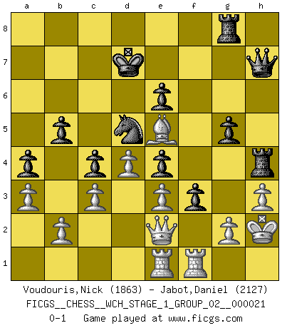 Last move : 0-1 2019 December 24 2:14:56 [Event "FICGS__CHESS__WCH_STAGE_1_GROUP_02__000021"] [Site "FICGS"] [Date "2019.07.01"] [Round "1"] [White "Voudouris,Nick"] [Black "Jabot,Daniel"] [Result "0-1"] [WhiteElo "1863"] [BlackElo "2127"] 1.d4 d5 2.e3 c5 3.f4 Nf6 4.c3 Nc6 5.Bd3 Bg4 6.Nf3 e6 7.O-O Bd6 8.Qe1 O-O 9.Ne5 Bf5 10.Qe2 Bxd3 11.Qxd3 Ne4 12.Nd2 f5 13.Qe2 Ne7 14.Ndf3 c4 15.Bd2 b5 16.Be1 Bxe5 17.Nxe5 Qe8 18.Nf3 h6 19.Bh4 Nc8 20.Ne5 Ncd6 21.Be1 a5 22.Qc2 Kh7 23.Rb1 Nf7 24.Nf3 Rb8 25.a3 Rb7 26.Ra1 g5 27.fxg5 hxg5 28.Nd2 Kg6 29.Nxe4 dxe4 30.Qe2 Nh6 31.Bf2 Ng4 32.Bg3 Nf6 33.Be5 Nd5 34.h3 Qc6 35.Rfc1 a4 36.Rf1 Qd7 37.Qf2 Qh7 38.Rae1 Rd7 39.Qg3 Kf7 40.Qh2 Ke8 41.Bd6 Rf6 42.Qe5 Kd8 43.Bb4 Kc8 44.Re2 Kb7 45.Bd6 Rg7 46.Qh2 Rg8 47.Qg3 f4 48.Qg4 Kc6 49.Be5 Rh6 50.R2e1 Kd7 51.Kh2 Rh4 52.Qe2 f3 0-1 Queen's pawn game Kingside Castling by player White (move 7) Kingside Castling by player Black (move 8) Player Black won this chess game. Follow this game move after move (download)No other master has such a terrific will to win. At the board he radiates danger, and even the strongest opponents tend to freeze, like rabbits when they smell a panther. Even his weaknesses are dangerous. As white, his opening game is predictable - you can make plans against it - but so strong that your plans almost never work. In the middle game his precision and invention are fabulous, and in the end game you simply cannot beat him. (Anonymous German Expert) Wenn du nicht weißt was du tun sollst, warte bis dein Gegner eine Idee hat. Sie wird sicher schlecht sein. (Siegbert Tarrasch) La esencia del Ajedrez es pensar acerca de lo que el Ajedrez es. (David Bronstein) Les échecs sont un jeu terrible. Si vous n'avez pas le centre, votre adversaire a une position plus libre. Par contre, si vous avez le centre, alors vous avez vraiment quelque chose pour laquelle vous inquiéter ! (Siegbert Tarrasch) Wisdom doesn't necessarily come with age. Sometimes age just shows up all by itself. (Tom Wilson)