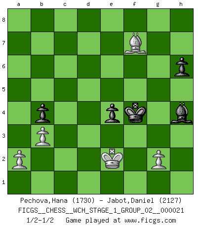 Last move : 1/2-1/2 2019 December 11 9:48:29 [Event "FICGS__CHESS__WCH_STAGE_1_GROUP_02__000021"] [Site "FICGS"] [Date "2019.07.01"] [Round "1"] [White "Pechova,Hana"] [Black "Jabot,Daniel"] [Result "1/2-1/2"] [WhiteElo "1730"] [BlackElo "2127"] 1.d4 d5 2.c4 c6 3.Nf3 Nf6 4.Nc3 e6 5.e3 Nbd7 6.Bd3 dxc4 7.Bxc4 b5 8.Bd3 Bb7 9.O-O a6 10.e4 c5 11.d5 Qc7 12.dxe6 fxe6 13.Bc2 Bd6 14.Ng5 Nf8 15.f4 O-O-O 16.Qe2 h6 17.Nf3 Bxf4 18.e5 Bxf3 19.Qxf3 Bxe5 20.Qa8+ Kd7 21.Qxa6 Bxh2+ 22.Kh1 Ke7 23.Rf3 Qe5 24.Be3 b4 25.Na4 N8d7 26.Re1 Bg3 27.Bxc5+ Nxc5 28.Qa7+ Rd7 29.Qxc5+ Qxc5 30.Rxe6+ Kxe6 31.Nxc5+ Ke7 32.Nxd7 Bd6 33.Nxf6 gxf6 34.Re3+ Be5 35.Re2 Rc8 36.Kg1 Kf8 37.b3 Kf7 38.Bf5 Rc5 39.Bd3 Bg3 40.Bc4+ Kg6 41.Re8 Kf5 42.Rg8 Be1 43.Kf1 Re5 44.Rb8 Bg3 45.Rb5 Kf4 46.Rxe5 fxe5 47.Ke2 e4 48.Bf7 Bh2 49.Kf2 Bg3+ 50.Ke2 Bh4 1/2-1/2 QGD Slav : 4.Nc3 Kingside Castling by player White (move 9) Queenside Castling by player Black (move 15) 10 pieces endgame at move 46 : White KBPPP , Black KBPPP WHITE : King + 1 Bishop 3 Pawns BLACK : King + 1 Bishop 3 Pawns This chess game ended in a draw. Follow this game move after move (download)You are for me the Queen on d8 and I am the Pawn on d7 !! (Eduard Gufeld) Charakterschwächen offenbaren sich normalerweise während einer Schachpartie. (Garry Kasparov) Las combinaciones han sido siempre el aspecto más intrigante del Ajedrez. Los Maestros las buscan, el público las aplauden, los críticos las alaban. La razón se debe a que las combinaciones hacen posible que el Ajedrez sea más que un ejercicio matemático con una carencia de vida. Ellas son la poesía del juego, son del Ajedrez lo que la melodía es de la música. Ellas representan el triunfo de la mente sobre la materia. (Reuben Fine) Shah mat. Le roi est mort. Cri de fierté d'un joueur venant de terrasser son adversaire, courtoisement, sans effusion de sang. Men should grow up. - Yeah. And dogs should stop licking themselves. It's not gonna happen. (Gregory House to Dr. Cameron, House M.D.)
