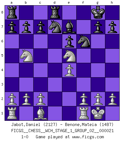 Last move : 1-0 2019 August 21 23:46:15 [Event "FICGS__CHESS__WCH_STAGE_1_GROUP_02__000021"] [Site "FICGS"] [Date "2019.07.01"] [Round "1"] [White "Jabot,Daniel"] [Black "Benone,Mateia"] [Result "1-0"] [WhiteElo "2127"] [BlackElo "1487"] 1.e4 d6 2.d4 Nf6 3.Nc3 e5 4.Nf3 Be7 5.Bc4 O-O 6.dxe5 dxe5 7.Qxd8 Rxd8 8.Nxe5 Be6 9.Bxe6 fxe6 10.O-O Nbd7 11.Nb5 1-0 This chess game has been lost on time (started : 2019.07.01 23:47:40) Pirc defense Kingside Castling by player Black (move 5) Kingside Castling by player White (move 10) Player White won this chess game. Follow this game move after move (download)War is the child of passion, passion is the child of narcissism and narcissism is the child. (...) Another game ? (Thibault de Vassal) Obwohl ich alt bin, darf mir niemand den Finger in den Mund stecken, sonst beisse ich. (Wilhelm Steinitz) Todavía soy una víctima del Ajedrez. Tiene toda la belleza del arte y mucho mas. No puede ser comercializado. El Ajedrez es mas puro que el arte en su posición social. (Marcel Duchamp) Tous ces prétendus hommes politiques sont les pions, les Cavaliers, les Tours ou les Fous d'une partie d'échecs qui se jouera tant qu'un hasard ne renversera pas l'échiquier. (Honoré de Balzac) No man has ever achieved immortality in his own life time. (Unknown)
