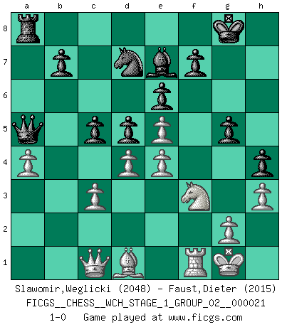 Last move : 1-0 2019 July 31 9:29:31 [Event "FICGS__CHESS__WCH_STAGE_1_GROUP_02__000021"] [Site "FICGS"] [Date "2019.07.01"] [Round "1"] [White "Slawomir,Weglicki"] [Black "Faust,Dieter"] [Result "1-0"] [WhiteElo "2048"] [BlackElo "2015"] 1.d4 c6 2.e4 d5 3.e5 Bf5 4.Nf3 e6 5.Be2 Nd7 6.O-O Be7 7.h3 h5 8.c3 Nh6 9.Be3 g5 10.Qc1 Rg8 11.Nh2 Bg6 12.Qd1 h4 13.a4 Qc7 14.b4 a5 15.bxa5 Qxa5 16.Qc1 Qd8 17.Nd2 Nf5 18.Ng4 Kf8 19.Nf3 Nxe3 20.fxe3 Ra7 21.Bd1 Qa5 22.Ra2 c5 23.Raf2 Bd3 24.Nh6 Bxf1 25.Nxg8 Kxg8 26.Rxf1 Ra8 27.e4 1-0 Queen's pawn Kingside Castling by player White (move 6) Player White won this chess game. Follow this game move after move (download)Before the endgame, the Gods have placed the middle game. (Siegbert Tarrasch) Bobby Fischer ist kein Vorbild für die heutige Jugend. (Viktor Kortschnoi) Robert Fischer es la ley hacia si mismo. (Larry Evans) Tout change constamment, y compris dans le monde des Echecs. (Botvinnik) The ultimate in disposing one's troops is to be without ascertainable shape. Then the most penetrating spies cannot pry in nor can the wise lay plans against you. (Sun Tzu)