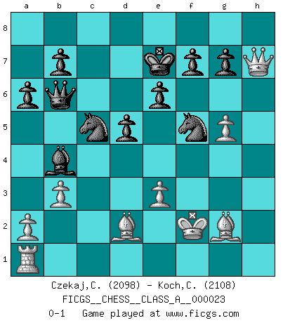 Last move : 0-1 2007 November 7 12:48:32 [Event "FICGS__CHESS__CLASS_A__000023"] [Site "FICGS"] [Date "2007.06.16"] [Round "1"] [White "Czekaj,Christophe"] [Black "Koch,Christian"] [Result "0-1"] [WhiteElo "2098"] [BlackElo "2108"] 1.d4 d5 2.Nf3 Nf6 3.e3 Bf5 4.c4 c6 5.cxd5 cxd5 6.Qb3 Qc7 7.Nc3 e6 8.Nh4 Bg4 9.h3 Bh5 10.g4 Bg6 11.g5 Nfd7 12.Nb5 Qb6 13.Nxg6 hxg6 14.Bd2 Nc6 15.Qd1 Be7 16.f4 Rc8 17.Nc3 Na5 18.b3 Nc6 19.h4 Ba3 20.h5 Ke7 21.Kf2 gxh5 22.Rxh5 Rxh5 23.Qxh5 a6 24.f5 Nxd4 25.Qh7 Rxc3 26.Bxc3 Nxf5 27.Bd2 Nc5 28.Bg2 Bb4 0-1 Queen's pawn game Player Black won this chess game. Follow this game move after move (download)Chess is everything: art, science and sport. (Anatoly Karpov) Ich spiele ehrlich und spiele, um zu gewinnen. Wenn ich verliere nehme ich meine Medizin. (Robert James Fischer) Fischer deseaba darle a los Rusos una sopa de su propia medicina. (Larry Evans) Nous sommes les pions de la mystérieuse partie d'Echecs jouée par Dieu. Il nous déplace, nous arrête, nous pousse encore, puis nous lance un à un dans la boîte du Néant. Epitaphe sur la tombe de David Janowsky (1868-1927). I don't diet. I just don't eat as much as I'd like to. (Linda Evangelista, supermodel)