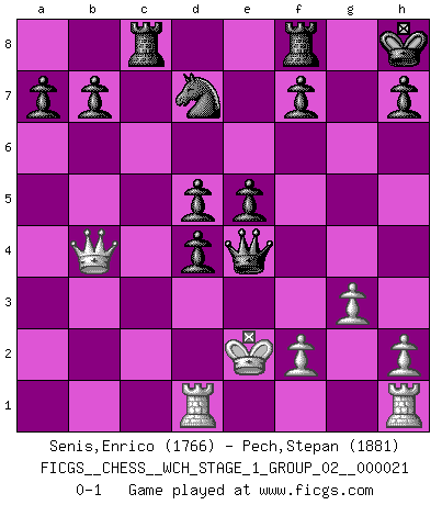Last move : 0-1 2019 September 8 14:54:35 [Event "FICGS__CHESS__WCH_STAGE_1_GROUP_02__000021"] [Site "FICGS"] [Date "2019.07.01"] [Round "1"] [White "Senis,Enrico"] [Black "Pech,Stepan"] [Result "0-1"] [WhiteElo "1766"] [BlackElo "1881"] 1.e4 e6 2.d4 d5 3.Nc3 Bb4 4.e5 c5 5.a3 Bxc3+ 6.bxc3 Ne7 7.Qg4 O-O 8.Bh6 Nf5 9.Bg5 Qb6 10.Bf6 Qb2 11.Rd1 Qxc3+ 12.Rd2 Kh8 13.Ne2 Qxa3 14.Ng3 gxf6 15.Bd3 fxe5 16.Nxf5 exf5 17.Bxf5 Qa1+ 18.Rd1 Qc3+ 19.Kf1 cxd4 20.g3 Qxc2 21.Bxc8 Qxc8 22.Qg5 Qh3+ 23.Ke1 Nd7 24.Qe7 Rac8 25.Qb4 Qg2 26.Ke2 Qe4+ 0-1 French : Winawer, Advance, poisoned pawn variation Kingside Castling by player Black (move 7) Player Black won this chess game. Follow this game move after move (download)We must make sure that Chess will not be like a dead language, very interesting, but for a very small group. (Sytze Faber) Je mehr wir mit Computern analysieren, desto mehr glauben wir an Verteidigung. (Vladimir Kramnik) Bobby Fischer es el mas grande genio de Ajedrez de todos los tiempos. (Alexander Kotov) Je ne suis pas le dernier à jouer lâchement des coups douteux pendant le zeïtnot de l'adversaire pour l'achever: en effet les coups qui font le plus peur sont ceux que l'on ne comprend pas. Je me fais souvent peur quand je joue. (Un professeur anonyme) The difference between stupidity and genius is that genius has its limits. (Murphy)