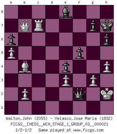 Last move : 1/2-1/2 2019 July 27 19:54:40 [Event "FICGS__CHESS__WCH_STAGE_1_GROUP_03__000021"] [Site "FICGS"] [Date "2019.07.01"] [Round "1"] [White "Walton,John"] [Black "Velasco,Jose Maria"] [Result "1/2-1/2"] [WhiteElo "2055"] [BlackElo "1832"] 1.d4 d5 2.c4 e6 3.Nf3 Nf6 4.g3 dxc4 5.Bg2 a6 6.O-O Nc6 7.e3 Bd7 8.Qe2 Bd6 9.Qxc4 O-O 10.Rd1 Qe7 11.Nc3 h6 12.Qe2 Rad8 13.Nd2 e5 14.d5 Na7 15.Nde4 Nxe4 16.Nxe4 Nc8 17.Qc2 Be8 18.Bd2 f5 19.Nxd6 Nxd6 20.Ba5 Rd7 21.Rdc1 Rf7 22.a4 e4 23.Ra3 Nc8 24.Bf1 Kh7 25.Bc3 Qd8 26.h4 Rfe7 27.Bb4 Rf7 28.Rc3 Nb6 29.d6 cxd6 30.Qd1 d5 31.Qd4 Nc4 32.a5 Qb8 33.Bxc4 dxc4 34.Qxc4 Qe5 35.Qc8 Rd5 36.Rc7 Rxc7 37.Rxc7 Rd1+ 38.Kh2 Qb5 39.Qxb7 Rh1+ 40.Kxh1 Qf1+ 41.Kh2 Qxf2+ 42.Kh3 Qf1+ 43.Kh2 Qf2+ 44.Kh3 Qf1+ 45.Kh2 Qf2+ 1/2-1/2 Queen's gambit declined Kingside Castling by player White (move 6) Kingside Castling by player Black (move 9) This chess game ended in a draw. Follow this game move after move (download)The combination player thinks forward; he starts from the given position, and tries the forceful moves in his mind. (Emanuel Lasker) Ich las kürzlich ein Buch von Nietzsche. Er sagte Religion verdumme nur die Menschen. Ich stimme zu. (Robert James Fischer) Combinaciones deslumbrantes son para la mayoría, mover madera es para los pocos. (Georg Kieninger) L'attaque fait le spectacle, la défense gagne les matchs. (Dicton footballistique) History is a gallery of pictures in which there are few originals and many copies. (Alexis de Tocqueville)