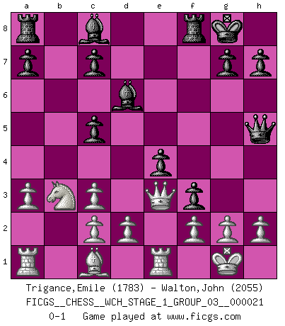 Last move : 0-1 2019 July 17 7:11:46 [Event "FICGS__CHESS__WCH_STAGE_1_GROUP_03__000021"] [Site "FICGS"] [Date "2019.07.01"] [Round "1"] [White "Trigance,Emile"] [Black "Walton,John"] [Result "0-1"] [WhiteElo "1783"] [BlackElo "2055"] 1.a3 e5 2.e4 Nf6 3.Nc3 Nc6 4.Nf3 d5 5.exd5 Nxd5 6.Bb5 Nxc3 7.bxc3 Bd6 8.Qe2 O-O 9.Qe4 Qe8 10.O-O f5 11.Qe2 e4 12.Bxc6 bxc6 13.Nd4 c5 14.Nb3 f4 15.Re1 f3 16.Qe3 Qh5 0-1 Anderssen's Opening Kingside Castling by player Black (move 8) Kingside Castling by player White (move 10) Player Black won this chess game. Follow this game move after move (download)Those who say they understand Chess, understand nothing. (Robert Hubner) Herr Iljumschinow ist ein etwas merkwürdiger Geschäftsmann: Er arbeitet zusammen mit Leuten wie Muammar al-Gaddafi; früher ist das Saddam Hussein gewesen. (Joel Lautier) Botvinnik trató de alejar el misterio referente al Ajedrez, siempre relacionandolo a situaciones de la vida diaria. Solía llamar al Ajedrez un problema inexacto típico, similar a aquellos en que la gente tiene siempre que resolver a cada día. (Garry Kasparov) Les réformistes prétendent que les progrès de la théorie conduiront à la disparition des échecs, et qu'il faut, pour leur rendre vie, en remanier les règles. En réalité, qu'exprime cette affirmation? Le mépris de l'intuition, de l'imagination et de tous les autres éléments qui font des échecs un art. (Alexander Alekhine) Luck has a peculiar habit of favoring those who don't depend on it. (Author unknown)