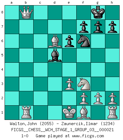 Last move : 1-0 2019 July 9 23:17:17 [Event "FICGS__CHESS__WCH_STAGE_1_GROUP_03__000021"] [Site "FICGS"] [Date "2019.07.01"] [Round "1"] [White "Walton,John"] [Black "Zaunercik,Ilmar"] [Result "1-0"] [WhiteElo "2055"] [BlackElo "1234"] 1.Nf3 d5 2.c4 dxc4 3.e3 b5 4.a4 c6 5.axb5 cxb5 6.Nc3 a6 7.Nxb5 axb5 8.Rxa8 Bb7 9.Ra1 Nf6 10.b3 e6 11.bxc4 Bb4 12.Qb3 Qd6 13.Rb1 Nc6 14.cxb5 Bxd2+ 15.Bxd2 O-O 16.bxc6 Bxc6 17.Bb4 Bd5 18.Bxd6 Rb8 19.Qxb8+ 1-0 Reti accepted Kingside Castling by player Black (move 15) Player White won this chess game. Follow this game move after move (download)He who fears an isolated Queen's Pawn should give up Chess. (Siegbert Tarrasch) Wie, soll nun auch die Opposition abgeschafft werden? Ja, es tut mir leid, Ihnen diesen Schmerz nicht ersparen zu können. (Aaron Nimzowitsch) El Ajedrez es un cuento de Hadas de las 1001 metidas de pata. (Savielly Tartakower) Des idées, des idées, j'en ai cent, j'en ai mille. Des bonnes, des mauvaises, applicables, irréalisables... Il suffit de faire le tri ! (Roos) If you lose the game you should win the analysis! (Proverb)