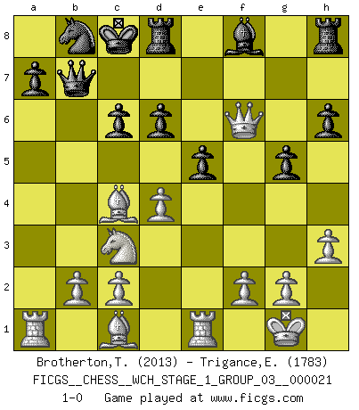 Last move : 1-0 2019 September 1 18:9:3 [Event "FICGS__CHESS__WCH_STAGE_1_GROUP_03__000021"] [Site "FICGS"] [Date "2019.07.01"] [Round "1"] [White "Brotherton,Trevor"] [Black "Trigance,Emile"] [Result "1-0"] [WhiteElo "2013"] [BlackElo "1783"] 1.Nf3 f5 2.d3 d6 3.e4 e5 4.Nc3 Nf6 5.exf5 Bxf5 6.d4 Nbd7 7.Bc4 Qe7 8.O-O O-O-O 9.Re1 Bg4 10.h3 Bxf3 11.Qxf3 h6 12.a4 g5 13.a5 Nb8 14.a6 c6 15.axb7+ Qxb7 16.Qxf6 1-0 Reti v Dutch Kingside Castling by player White (move 8) Queenside Castling by player Black (move 8) Player White won this chess game. Follow this game move after move (download)Spassky will not be psyched out by Fischer. (Mike Goodall) Computer sind die einzigen Gegner, die nicht immer eine Ausrede auf Lager haben, wenn sie gegen mich verlieren. (Robert James Fischer) El Ajedrez es imaginación. (David Bronstein) Les échecs, c'est la lutte contre l'erreur. (Johannes Zukertort) Life is like a ten-speed bicycle: most of us have gears we never use. (Charles M. Schulz)