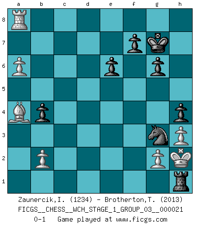 Last move : 0-1 2019 October 3 2:20:5 [Event "FICGS__CHESS__WCH_STAGE_1_GROUP_03__000021"] [Site "FICGS"] [Date "2019.07.01"] [Round "1"] [White "Zaunercik,Ilmar"] [Black "Brotherton,Trevor"] [Result "0-1"] [WhiteElo "1234"] [BlackElo "2013"] 1.e4 Nf6 2.e5 Nd5 3.d4 d6 4.exd6 cxd6 5.c4 Nf6 6.Nf3 g6 7.h3 Bg7 8.Nc3 O-O 9.Be3 d5 10.Be2 dxc4 11.Qd2 a6 12.Bxc4 b5 13.Bb3 Bb7 14.Qe2 Nc6 15.O-O Na5 16.Bc2 Nc4 17.Bc1 Bxf3 18.Qxf3 Qxd4 19.Be3 Nxe3 20.Qxe3 Qxe3 21.fxe3 Rac8 22.Bb3 e6 23.Rf2 Rc7 24.Rd1 h5 25.Rfd2 Bh6 26.Re2 Rb8 27.Rd6 b4 28.Nd1 Rc1 29.Rxa6 Ne4 30.Re1 Rd8 31.a4 Rd3 32.Ra8+ Kg7 33.a5 Bxe3+ 34.Rxe3 Rxe3 35.Ba4 Re1+ 36.Kh2 h4 37.a6 Ng3 38.Nf2 Rh1+ 39.Nxh1 Rxh1+ 0-1 Alekhine's defense Kingside Castling by player Black (move 8) Kingside Castling by player White (move 15) Player Black won this chess game. Follow this game move after move (download)Up to this point White has been following well-known analysis. But now he makes a fatal error: he begins to use his own head. (Siegbert Tarrasch) Wenn ein Kopf und ein Buch zusammenstoßen und es klingt hohl, ist es denn allemal im Buche? (Georg Christoph Lichtenberg) Ser exitoso en el Ajedrez te permite descubrir tu propia personalidad. Eso es lo que deseo para los niños de mi clase. (Saudin Robovic) Toutes choses étant égales, c'est la conviction qui gagne. Alliée à une volonté de vaincre, elle sert de détonateur, suscite des idées, disperse les doutes et aide à penser clairement. (Robert Fischer) In my experience, there's no such thing as luck. (Obi-Wan Kenobi in Star Wars ep.4)