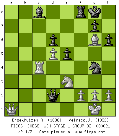 Last move : 1/2-1/2 2019 July 25 14:3:0 [Event "FICGS__CHESS__WCH_STAGE_1_GROUP_03__000021"] [Site "FICGS"] [Date "2019.07.01"] [Round "1"] [White "Broekhuizen,A. T. S."] [Black "Velasco,Jose Maria"] [Result "1/2-1/2"] [WhiteElo "1886"] [BlackElo "1832"] 1.e4 e5 2.Nf3 Nc6 3.Bb5 a6 4.Ba4 Nf6 5.O-O b5 6.Bb3 Bb7 7.Re1 Bc5 8.c3 Bb6 9.d4 d6 10.Be3 O-O 11.d5 Ne7 12.Bxb6 cxb6 13.Nbd2 Nd7 14.Bc2 Nc5 15.b4 Nd7 16.c4 h6 17.cxb5 axb5 18.Nf1 f5 19.Ne3 fxe4 20.Nd2 Bc8 21.Nxe4 Nf6 22.Nc3 Qe8 23.a4 bxa4 24.Nxa4 b5 25.Nc3 Rxa1 26.Qxa1 Ng6 27.Nxb5 Qxb5 28.Bxg6 Qxb4 29.Rc1 Ng4 30.Rc4 Qd2 1/2-1/2 Ruy Lopez : Archangelsk (counterthrust) variation Kingside Castling by player White (move 5) Kingside Castling by player Black (move 10) This chess game ended in a draw. Follow this game move after move (download)Checkers is for tramps. (Paul Morphy) Der Freibauer hat für mich eine Seele, genau wie der Mensch, Wünsche, die unerkannt in ihm schlummern, und Befürchtungen, von deren Existenz er selbst kaum ahnt. (Aaron Nimzowitsch) Los Peones son el alma de una partida de Ajedrez. (Francois Andre Danican Philidor) Je ne crois pas en la psychologie, je crois aux bons coups. (Robert Fischer) He who defends everything defends nothing. (Frederick the Great)