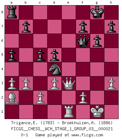 Last move : 0-1 2019 July 24 7:44:50 [Event "FICGS__CHESS__WCH_STAGE_1_GROUP_03__000021"] [Site "FICGS"] [Date "2019.07.01"] [Round "1"] [White "Trigance,Emile"] [Black "Broekhuizen,A. T. S."] [Result "0-1"] [WhiteElo "1783"] [BlackElo "1886"] 1.a3 c5 2.e4 g6 3.Nf3 Bg7 4.Bc4 Nc6 5.d3 e6 6.Nbd2 Nge7 7.O-O d5 8.exd5 exd5 9.Ba2 O-O 10.Rb1 a5 11.h3 Nf5 12.b3 Re8 13.Bb2 Bxb2 14.Rxb2 Nfd4 15.Re1 Rxe1+ 16.Qxe1 Bxh3 17.gxh3 Nxf3+ 18.Nxf3 Qf6 19.Rb1 Qxf3 20.Qe3 Qf6 21.Re1 Nd4 0-1 Anderssen's Opening Kingside Castling by player White (move 7) Kingside Castling by player Black (move 9) Player Black won this chess game. Follow this game move after move (download)Could we look into the head of a Chess player, we should see there a whole world of feelings, images, ideas, emotion and passion. (Alfred Binet) Kombinieren und Schwarzhandel gehören verboten. (Savielly Grigorievitsch Tartakower) Una victoria por una combinación errónea, aunque sea espectacular, me llena de horror artístico. (Wilhelm Steinitz) Un millionnaire : 'Monsieur Steinitz ! Vous ne participez aux tournois que pour l'argent, alors que moi je n'y viens que pour l'honneur.' Steinitz : 'Chacun joue pour ce qu'il n'a pas'... There are two kinds of people in the world, my friend. Those who have a loaded gun and those who dig. You dig ! (Blondie in The Good, The Bad and The Ugly)