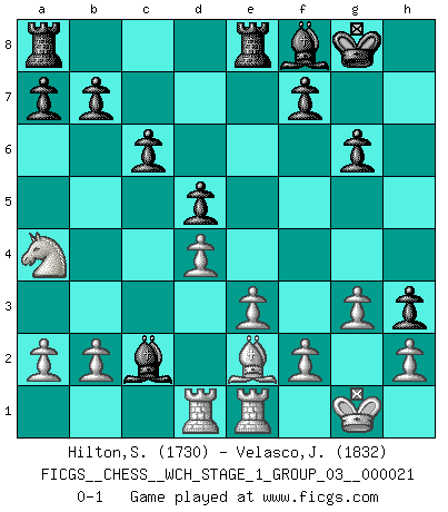 Last move : 0-1 2019 July 9 17:31:0 [Event "FICGS__CHESS__WCH_STAGE_1_GROUP_03__000021"] [Site "FICGS"] [Date "2019.07.01"] [Round "1"] [White "Hilton,Stephen"] [Black "Velasco,Jose Maria"] [Result "0-1"] [WhiteElo "1730"] [BlackElo "1832"] 1.d4 d5 2.c4 e6 3.cxd5 exd5 4.Nc3 Nf6 5.Bg5 c6 6.e3 Be7 7.Bd3 Nbd7 8.Nge2 O-O 9.Qc2 Re8 10.O-O Nf8 11.Ng3 h6 12.Bxf6 Bxf6 13.Rac1 g6 14.Rfe1 Bd7 15.Na4 Ne6 16.Nc5 Nxc5 17.Qxc5 Bg7 18.Ne2 Bf8 19.Qc2 Qf6 20.Nc3 h5 21.Rcd1 h4 22.Na4 h3 23.g3 Qf3 24.Bf1 Bf5 25.Qe2 Qxe2 26.Bxe2 Bc2 0-1 Queen's gambit declined Kingside Castling by player Black (move 8) Kingside Castling by player White (move 10) Player Black won this chess game. Follow this game move after move (download)Fischer was a master of clarity and a king of artful positioning. His opponents would see where he was going but were powerless to stop him. (Bruce Pandolfini) Kein Schachspieler kann gut schlafen. (H. G. Wells) Los Peones son nacidos libres, y aún así, se encuentran por doquier encadenados. (Rick Kennedy) Les échecs sont un jeu terrible. Si vous n'avez pas le centre, votre adversaire a une position plus libre. Par contre, si vous avez le centre, alors vous avez vraiment quelque chose pour laquelle vous inquiéter ! (Siegbert Tarrasch) If only people were all showed a certain minimum level of niceness; if only people didn't retract verbal draw offers (without draw box ticked) on ficgs; if only people didn't kill; if only people didn't run concentration / extermination camps, if only people didn't drop nuclear bombs on Hiroshima and Nagasaki, and so on - it would be a much more beautiful world. But sadly, things are not so... (Normajean Yates)