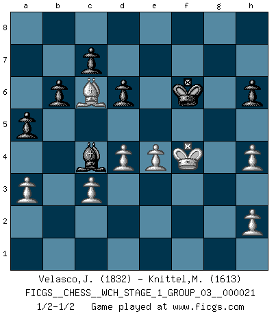 Last move : 1/2-1/2 2019 July 29 14:41:8 [Event "FICGS__CHESS__WCH_STAGE_1_GROUP_03__000021"] [Site "FICGS"] [Date "2019.07.01"] [Round "1"] [White "Velasco,Jose Maria"] [Black "Knittel,Martin"] [Result "1/2-1/2"] [WhiteElo "1832"] [BlackElo "1613"] 1.c4 e5 2.Nc3 Nf6 3.Nf3 Nc6 4.g3 Bb4 5.Bg2 O-O 6.O-O e4 7.Ng5 Bxc3 8.bxc3 Re8 9.f3 exf3 10.Nxf3 Qe7 11.e3 Qc5 12.Nd4 Qxc4 13.Rxf6 Nxd4 14.Qh5 Ne2+ 15.Kf2 Nxc1 16.Bf1 g6 17.Bxc4 gxh5 18.Bxf7+ Kg7 19.Bxe8 Kxf6 20.Rxc1 h4 21.gxh4 d6 22.Ba4 Be6 23.Rb1 b6 24.a3 Rg8 25.Bc6 Rg4 26.Rb4 h6 27.Rxg4 Bxg4 28.Kg3 Be2 29.d4 Bc4 30.Kf3 a5 31.e4 Bf1 32.Kg4 Bc4 33.Kg3 Bf1 34.Kf4 Bc4 35.Ke3 Ke6 36.Kf4 Kf6 37.Ke3 Ke6 38.Kf4 Kf6 1/2-1/2 English Opening Kingside Castling by player Black (move 5) Kingside Castling by player White (move 6) This chess game ended in a draw. Follow this game move after move (download)All that matters on the Chessboard is good moves. (Bobby Fischer) Wer nie einen Fehler gemacht hat, hat nie etwas Neues ausprobiert. (Albert Einstein) El Ajedrez es un juego de pelea el cual es puramente intelectual e incluye la suerte. (Richard Reti) Le plus grand jeu de l'esprit jamais inventé, plus vous l'apprenez, plus vous y prenez du plaisir. (Garry Kasparov) You cannot beat a roulette table unless you steal money from it. (Albert Einstein)