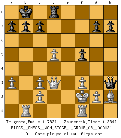 Last move : 1-0 2019 July 7 20:21:45 [Event "FICGS__CHESS__WCH_STAGE_1_GROUP_03__000021"] [Site "FICGS"] [Date "2019.07.01"] [Round "1"] [White "Trigance,Emile"] [Black "Zaunercik,Ilmar"] [Result "1-0"] [WhiteElo "1783"] [BlackElo "1234"] 1.a3 e5 2.e4 Nf6 3.Nc3 Nc6 4.Nf3 d5 5.exd5 Nxd5 6.Bb5 Nxc3 7.bxc3 Bd6 8.Qe2 Qf6 9.Qe4 Bd7 10.Nd4 Bc5 11.O-O O-O-O 12.Nxc6 Bxc6 13.Bxc6 Qxc6 14.Qxe5 Rhe8 15.Qf5+ Kb8 16.d4 Bd6 17.Qd3 Re4 18.d5 Qe8 19.Be3 f5 20.Rab1 Bxh2+ 21.Kxh2 Qh5+ 22.Kg1 Rh4 23.f3 Rh1+ 24.Kf2 Rh2 25.Bf4 Qh4+ 26.Bg3 Qh3 27.Bxh2 1-0 Anderssen's Opening Kingside Castling by player White (move 11) Queenside Castling by player Black (move 11) Player White won this chess game. Follow this game move after move (download)The beauty of a move lies not in its' appearance but in the thought behind it. (Siegbert Tarrasch) Um dein Spiel zu verbessern musst du zuallererst das Endspiel studieren, denn diese kann unabhängig studiert werden. Die Eröffnung und das Mittelspiel müssen immer in Bezug gesetzt werden zum Endspiel. (José Raúl Capablanca) No todos los artistas son jugadores de Ajedrez, pero todos los jugadores de Ajedrez son artistas. (Marcel Duchamp) La tactique est l'élément le plus important du milieu de jeu. (Siegbert Tarrasch) First of all, we have to go back to the classical time control. (Anatoly Karpov)