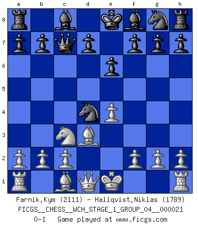 Last move : 0-1 2019 July 9 8:51:13 [Event "FICGS__CHESS__WCH_STAGE_1_GROUP_04__000021"] [Site "FICGS"] [Date "2019.07.01"] [Round "1"] [White "Farnik,Kym"] [Black "Hallqvist,Niklas"] [Result "0-1"] [WhiteElo "2111"] [BlackElo "1789"] 1.d4 e6 2.Nf3 c5 3.e4 cxd4 4.Nxd4 Nc6 5.Nc3 Qc7 6.Bd3 Nxd4 0-1 Queen's pawn Player Black won this chess game. Follow this game move after move (download)Your body has to be in top condition. Your Chess deteriorates as your body does. You can't separate body from mind. (Bobby Fischer) Mit Schach schule ich mein Gefühl für Geometrie, was für Tennis und Schach gleichermaßen wichtig ist. (Boris Becker) Los libros de Ajedrez deben de usarse igual como usamos los anteojos: para mejorar la vista, aunque algunos jugadores los quieren usar como si ellos les otorgaran la vision. (José Raúl Capablanca) Vous savez, camarade Pachman, je n'éprouve pas de plaisir à être ministre, je jouerais plutôt aux échecs comme vous, ou alors ferais une révolution au Venezuela. (Che Guevara à Ludek Pachman, 'Checkmate in Prague', 1975) Ah, the Socrating method. The best way we have of teaching everything-apart from juggling chainsaws. (Gregory House, House M.D.)