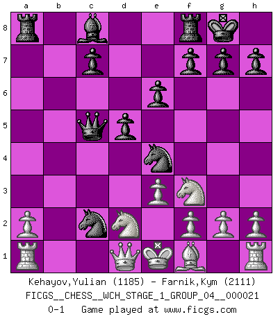 Last move : 0-1 2019 August 21 23:46:15 [Event "FICGS__CHESS__WCH_STAGE_1_GROUP_04__000021"] [Site "FICGS"] [Date "2019.07.01"] [Round "1"] [White "Kehayov,Yulian"] [Black "Farnik,Kym"] [Result "0-1"] [WhiteElo "1185"] [BlackElo "2111"] 1.d4 Nf6 2.e3 d5 3.c4 e6 4.c5 b6 5.b4 a5 6.Bd2 axb4 7.Bxb4 bxc5 8.Bxc5 Bxc5 9.dxc5 O-O 10.Nf3 Qe7 11.Qd4 Nc6 12.Qc3 Ne4 13.Qc2 Nb4 14.Qd1 Qxc5 15.Nbd2 Nc2+ 0-1 This chess game has been lost on time (started : 2019.07.01 23:47:45) Queen's pawn game Kingside Castling by player Black (move 9) Player Black won this chess game. Follow this game move after move (download)When in doubt... play Chess ! (Tevis) Zum Sieg gelangt man nicht, wenn man gut, sondern nur wenn man besser spielt (Savielly Grigorievitsch Tartakower) Mi estilo es algo parecido entre un poco de Tal y Petrosian. (Reshevsky) Le jeu d'échecs fait naître et fortifie en nous plusieurs qualités précieuses dans le cours de l'existence, telles que la prévoyance, la circonspection, la prudence, et la persévérance. (Benjamin Franklin - 1783, la morale des échecs) Excelling at chess has long been considered a symbol of more general intelligence. That is an incorrect assumption in my view, as pleasant as it might be. But for the purposes of argument and investigation, chess is, in Russkin-Gutman's words, 'an unparalleled laboratory, since both the learning process and the degree of ability obtained can be objectified and quantified, providing an excellent comparative framework on which to use rigorous analytical techniques.' (The Chess Master and the Computer, by Garry Kasparov - 2010)