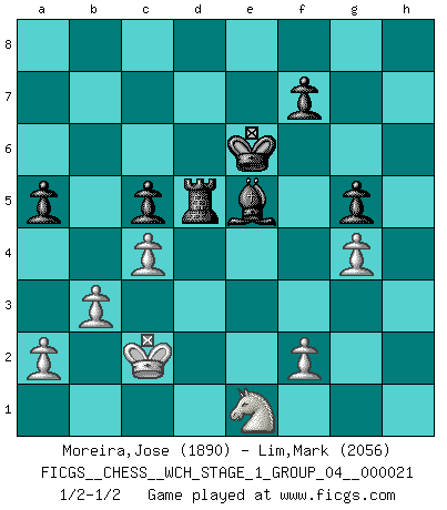Last move : 1/2-1/2 2019 August 16 12:39:12 [Event "FICGS__CHESS__WCH_STAGE_1_GROUP_04__000021"] [Site "FICGS"] [Date "2019.07.01"] [Round "1"] [White "Moreira,Jose"] [Black "Lim,Mark"] [Result "1/2-1/2"] [WhiteElo "1890"] [BlackElo "2056"] 1.e4 e6 2.d4 d5 3.Nc3 Nf6 4.Bg5 dxe4 5.Nxe4 Nbd7 6.Nxf6+ Nxf6 7.Nf3 h6 8.Be3 Bd6 9.Bc4 O-O 10.Qe2 b6 11.O-O-O Bb7 12.Rhg1 Nd5 13.g4 Nf4 14.Bxf4 Bxf4+ 15.Kb1 Qf6 16.h4 g5 17.hxg5 hxg5 18.Rh1 Kg7 19.d5 b5 20.Bb3 c5 21.Qxb5 Bxd5 22.Qd3 Rfb8 23.Qh7+ Kf8 24.Qh8+ Qxh8 25.Rxh8+ Ke7 26.Rxb8 Rxb8 27.Bxd5 Rd8 28.c4 exd5 29.Kc2 Ke6 30.b3 a5 31.Ne1 Be5 32.Rxd5 Rxd5 1/2-1/2 French : Burn variation Kingside Castling by player Black (move 9) Queenside Castling by player White (move 11) This chess game ended in a draw. Follow this game move after move (download)Chess is a terrible game. If you have no center, your opponent has a freer position. If you do have a center, then you really have something to worry about ! (Siegbert Tarrasch) Der vorletzte Fehler gewinnt. (Savielly Grigorievitsch Tartakower) Debemos de asegurarnos de que el Ajedrez no se convierta en un lenguaje muerto, muy interesante, pero solo para un grupo muy pequeño. (Sytze Faber) Le joueur d'Echecs qui veut atteindre le top est obligé de développer son propre credo créatif. Alexeï Stepanovicth Souétine. Il est facile d'écrire des livres ! Ce qui est difficile, c'est de jouer ! (Alexeï Stepanovicth Souétine) In fact if nothing is done against this teddy bear, hereby I announce that I would quit chess, rapid chess, blitz chess, postal chess, email chess, server chess and correspondence chess I will then switch to a table game where teddy bears aren't going to be seen for a while, like Poker, or Roulette, all 18+ games. (Elmer Valderrama)