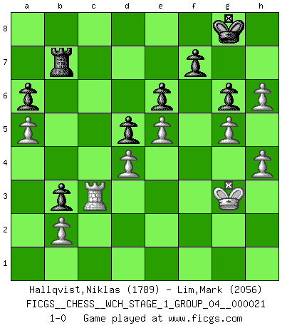 Last move : 1-0 2019 October 22 18:41:18 [Event "FICGS__CHESS__WCH_STAGE_1_GROUP_04__000021"] [Site "FICGS"] [Date "2019.07.01"] [Round "1"] [White "Hallqvist,Niklas"] [Black "Lim,Mark"] [Result "1-0"] [WhiteElo "1789"] [BlackElo "2056"] 1.c4 e6 2.g3 Nf6 3.Bg2 d5 4.Nf3 dxc4 5.Qa4+ c6 6.Qxc4 b5 7.Qb3 Bb7 8.O-O Nbd7 9.d4 a6 10.Ne5 Nxe5 11.dxe5 Nd5 12.Nc3 Be7 13.Nxd5 cxd5 14.a4 Bc6 15.a5 Rc8 16.Be3 O-O 17.Bb6 Qd7 18.Rfd1 Qb7 19.e3 Rfe8 20.Qd3 Qb8 21.Bd4 Bb7 22.Bf1 Rc4 23.Qb1 Rc6 24.Bd3 h6 25.Rc1 Rec8 26.Rf1 R8c7 27.h3 Bc5 28.Qe1 Bxd4 29.exd4 Rc4 30.Rd1 Qd8 31.Qe3 Kh8 32.f4 Rb4 33.Rd2 Bc8 34.g4 Bd7 35.g5 Qe7 36.gxh6 g6 37.Kh2 Qf8 38.h4 Rb3 39.Kh1 Qe7 40.Qg3 b4 41.Qg5 Qxg5 42.fxg5 Rxd3 43.Rxd3 Bb5 44.Rdf3 Bxf1 45.Rxf1 Kg8 46.Kg2 b3 47.Kg3 Rc2 48.Rf2 Rc7 49.Rf3 Rb7 50.Rc3 1-0 English Opening Kingside Castling by player White (move 8) Kingside Castling by player Black (move 16) Player White won this chess game. Follow this game move after move (download)You can only get good at Chess if you love the game. (Bobby Fischer) Die Leute spielen gegen mich seit 15 Jahren unter Ihren Möglichkeiten. (Robert James Fischer) El Ajedrez es imaginación. (David Bronstein) Les échecs sont un jeu terrible. Si vous n'avez pas le centre, votre adversaire a une position plus libre. Par contre, si vous avez le centre, alors vous avez vraiment quelque chose pour laquelle vous inquiéter ! (Siegbert Tarrasch) All the biggest technological inventions created by man - the airplane, the automobile, the computer - says little about his intelligence, but speaks volumes about his laziness. (Mark Kennedy)