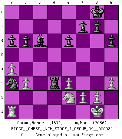 Last move : 0-1 2019 October 16 14:32:58 [Event "FICGS__CHESS__WCH_STAGE_1_GROUP_04__000021"] [Site "FICGS"] [Date "2019.07.01"] [Round "1"] [White "Csoma,Robert"] [Black "Lim,Mark"] [Result "0-1"] [WhiteElo "1671"] [BlackElo "2056"] 1.c4 e6 2.d4 Nf6 3.Nc3 d5 4.Bg5 Be7 5.e3 Nbd7 6.Nf3 O-O 7.Bd3 h6 8.Bh4 dxc4 9.Bxc4 c5 10.O-O a6 11.a4 cxd4 12.Qxd4 b6 13.Rfd1 Bb7 14.Ne5 Nxe5 15.Qxe5 Nd7 16.Bxe7 Nxe5 17.Bxd8 Nxc4 18.Be7 Rfe8 19.Ba3 Rac8 20.Rd7 Bc6 21.Ra7 Ra8 22.Rxa8 Rxa8 23.h3 Rd8 24.b3 Rd3 25.Ne2 Nxa3 0-1 This chess game has been lost on time (started : 2019.07.01 23:47:45) English Opening Kingside Castling by player Black (move 6) Kingside Castling by player White (move 10) Player Black won this chess game. Follow this game move after move (download)Bobby Fischer's current state of mind is indeed a tragedy. One of the world's greatest Chess players - the pride and sorrow of American Chess. (Frank Brady) Im Hotelzimmer gab es nur zwei Schaben. (Über die Turnierbedingungen) (Peter Swidler) Cuando la partida de Ajedrez termina, el Peón y el Rey regresan a la misma caja. (Irish saying) Les ravages du H expliquent la différence de niveau entre Tal et Thal [Abergel]. He is a liar. I just don't know what the lie is yet. (Horatio Caine, C.S.I. Miami)