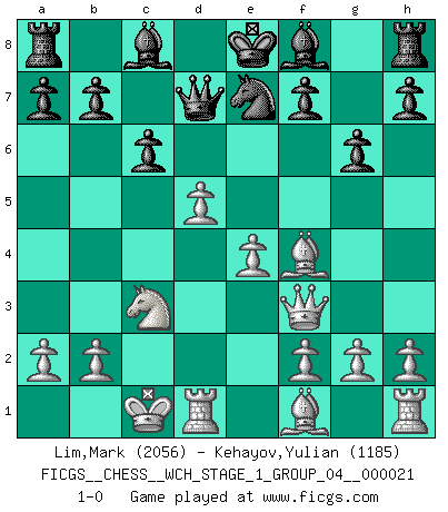 Last move : 1-0 2019 September 5 15:44:3 [Event "FICGS__CHESS__WCH_STAGE_1_GROUP_04__000021"] [Site "FICGS"] [Date "2019.07.01"] [Round "1"] [White "Lim,Mark"] [Black "Kehayov,Yulian"] [Result "1-0"] [WhiteElo "2056"] [BlackElo "1185"] 1.d4 d5 2.Nf3 Nc6 3.e3 Qd6 4.c4 e5 5.dxe5 Nxe5 6.cxd5 Nxf3+ 7.Qxf3 Ne7 8.Nc3 c6 9.e4 g6 10.Bf4 Qd7 11.O-O-O 1-0 This chess game has been lost on time (started : 2019.07.01 23:47:45) Queen's pawn game, Chigorin variation Queenside Castling by player White (move 11) Player White won this chess game. Follow this game move after move (download)A good sacrifice is one that is not necessarily sound but leaves your opponent dazed and confused. (Rudolph Spielmann) Wenn ein Kopf und ein Buch zusammenstoßen und es klingt hohl, ist es denn allemal im Buche? (Georg Christoph Lichtenberg) Los errores estan ahí, esperando a que se cometan. (Savielly Tartakower) Les échecs sont utiles à l'exercice de la faculté de penser et à celle de l'imagination. Car nous devons posséder une méthode élaborée pour atteindre des buts partout où nous devons conduire notre raison. (Leibnitz) The large trees attract high winds. (Chinese proverb)