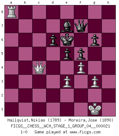 Last move : 1-0 2019 July 24 11:45:0 [Event "FICGS__CHESS__WCH_STAGE_1_GROUP_04__000021"] [Site "FICGS"] [Date "2019.07.01"] [Round "1"] [White "Hallqvist,Niklas"] [Black "Moreira,Jose"] [Result "1-0"] [WhiteElo "1789"] [BlackElo "1890"] 1.c4 e5 2.a3 Nf6 3.Nc3 g6 4.Nf3 Nc6 5.g3 Bg7 6.Bg2 O-O 7.O-O d6 8.d3 Re8 9.b4 Nd4 10.Nd2 c6 11.e3 Nf5 12.Nce4 Nxe4 13.dxe4 Nh6 14.a4 Be6 15.Ba3 Qc7 16.h3 Rac8 17.Qc2 f6 18.Bb2 Qd7 19.Kh2 Red8 20.a5 b6 21.axb6 axb6 22.Ra6 b5 23.Rfa1 Nf7 24.Qd3 Qb7 25.Bc3 Rc7 26.cxb5 cxb5 27.R6a5 Qc6 28.R1a3 Rb8 29.Nb1 Bf8 30.Ra6 Qc4 31.Qd1 Bc8 32.R6a5 Bd7 33.h4 Nd8 34.Ra1 Nc6 35.Ra8 Rbc8 36.Na3 Qxc3 37.Nxb5 Qxb4 38.Nxc7 Rxc7 39.Rb1 Qc4 40.Bf1 Qe6 41.Rc1 Kg7 42.h5 Be7 43.hxg6 hxg6 44.Bc4 Qh3+ 45.Kg1 Nb4 46.Bf1 Rxc1 47.Qxc1 Qg4 48.Qc7 Nc6 49.Ra1 Be8 50.Bb5 Qxe4 51.Rc1 Qd5 52.Bxc6 Bxc6 53.Rxc6 Qd1+ 54.Kh2 Kf7 55.Rc1 Qd5 56.Ra1 f5 57.Ra7 Qe6 58.Qb7 Qf6 59.Kg1 Qg5 60.Qb8 Qf6 61.Ra8 Qg7 62.f4 Kf6 63.Qb2 Kf7 64.Qb7 Ke6 65.Qc7 Qf7 66.Qc4+ 1-0 English Opening Kingside Castling by player Black (move 6) Kingside Castling by player White (move 7) Player White won this chess game. Follow this game move after move (download)We cannot resist the fascination of sacrifice, since a passion for sacrifices is part of a Chessplayer's nature. (Rudolf Spielman) Je mehr ich von der FIDE weiss, um so weniger verstehe ich. (Alexander Kalifman) Los finales de Peón son del Ajedrez lo que el cesped es del Golf. (Cecil Purdy) À la honte des hommes, on sait que les lois du jeu sont les seules qui soient partout justes, claires, inviolables et exécutées. Pourquoi l'Indien qui a donné les règles du jeu d'échecs est-il obéi de bon gré dans toute la terre, et que les décrétales des papes, par exemple, sont aujourd'hui un objet d'horreur et de mépris ? C'est que l'inventeur des échecs combina tout avec justesse pour la satisfaction des joueurs, et que les papes, dans leurs décrétales, n'eurent en vue que leur seul avantage. L'Indien voulut exercer également l'esprit des hommes et leur donner du plaisir; les papes ont voulu abrutir l'esprit des hommes. Voltaire (Dictionnaire philosophique / Garnier 1967) Without enthusiasm, virtue functions not at all, and vice only poorly. (Mignon McLaughlin, The Neurotic's Notebook, 1960)