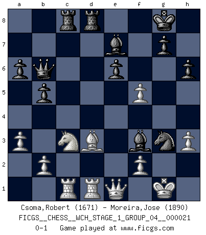Last move : 0-1 2019 September 2 23:42:34 [Event "FICGS__CHESS__WCH_STAGE_1_GROUP_04__000021"] [Site "FICGS"] [Date "2019.07.01"] [Round "1"] [White "Csoma,Robert"] [Black "Moreira,Jose"] [Result "0-1"] [WhiteElo "1671"] [BlackElo "1890"] 1.d4 Nf6 2.c4 e6 3.Nc3 d5 4.Bg5 Be7 5.e3 h6 6.Bh4 O-O 7.Nf3 b6 8.Bd3 Bb7 9.O-O Nbd7 10.Rc1 c5 11.Re1 dxc4 12.Bxc4 Rc8 13.Bd3 cxd4 14.Nxd4 a6 15.Qe2 b5 16.a3 Qb6 17.h3 Bd6 18.Bxf6 Nxf6 19.Nf3 Rfd8 20.Red1 Be7 21.e4 Nh5 22.g3 Nxg3 23.Qe1 f5 24.exf5 Bxf3 0-1 This chess game has been lost on time (started : 2019.07.01 23:47:45) Queen's pawn game Kingside Castling by player Black (move 6) Kingside Castling by player White (move 9) Player Black won this chess game. Follow this game move after move (download)Discovered check is the dive bomber of the Chessboard. (Reuben Fine) Die Elozahlen sind sehr schlecht für das Schach. Jetzt ist Schach eine Sportindustrie, die darauf zielt Elopunkte zu machen. (Miguel Najdorf) Haz el enroque temprano y seguido. (Rob Sillars) Vous savez, camarade Pachman, je n'éprouve pas de plaisir à être ministre, je jouerais plutôt aux échecs comme vous, ou alors ferais une révolution au Venezuela. (Che Guevara à Ludek Pachman, 'Checkmate in Prague', 1975) God, you are such an idiot. - Actually, I thought I was more of a jerk. (Gregory House to Stacy Warner, House M.D.)