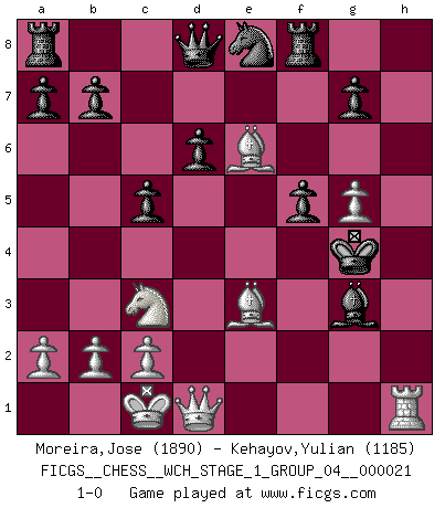 Last move : 1-0 2019 August 13 8:33:42 [Event "FICGS__CHESS__WCH_STAGE_1_GROUP_04__000021"] [Site "FICGS"] [Date "2019.07.01"] [Round "1"] [White "Moreira,Jose"] [Black "Kehayov,Yulian"] [Result "1-0"] [WhiteElo "1890"] [BlackElo "1185"] 1.e4 e5 2.Nf3 d6 3.d4 exd4 4.Nxd4 Bd7 5.Nc3 Nc6 6.Be3 Nxd4 7.Qxd4 c5 8.Qd2 Nf6 9.O-O-O Be7 10.f3 O-O 11.g4 Ne8 12.h4 Bxh4 13.g5 Bg3 14.f4 f6 15.Bc4+ Kh8 16.Rxh7+ Kxh7 17.Rh1+ Kg6 18.f5+ Bxf5 19.exf5+ Kxf5 20.Qd3+ Kg4 21.Be6+ f5 22.Qd1+ 1-0 Philidor : Exchange variation Queenside Castling by player White (move 9) Kingside Castling by player Black (move 10) Player White won this chess game. Follow this game move after move (download)Without error there can be no brilliancy. (Emanuel Lasker) Ich weiss nicht was Gott gegen mich auf 1.e4 antworten würde. (Robert James Fischer) El Ajedrez es despiadado: debes de estar preparado para matar gente. (Nigel Short) Si le désir cupide (et stupide) de gagner est une inépuisable source de souffrance, une combinaison brillante sur l'échiquier est une découverte : le coquelicot qui s'épanouit lorsque apparaît la Voie Lactée. (Arrabal) Nobody is always a winner, and anybody who says he is, is either a liar or doesn't play poker. (Amarillo Slim)