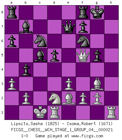 Last move : 1-0 2019 September 1 7:25:33 [Event "FICGS__CHESS__WCH_STAGE_1_GROUP_04__000021"] [Site "FICGS"] [Date "2019.07.01"] [Round "1"] [White "Lipsits,Sasha"] [Black "Csoma,Robert"] [Result "1-0"] [WhiteElo "1825"] [BlackElo "1671"] 1.d4 Nf6 2.Nf3 d5 3.c4 e6 4.Nc3 Be7 5.Bg5 O-O 6.e3 h6 7.Bh4 c5 8.dxc5 Nc6 9.a3 dxc4 10.Bxc4 g5 11.Bg3 Bxc5 12.Qc2 Qe7 13.O-O-O a6 14.Nd2 b5 15.Be2 Bb7 16.h4 b4 17.hxg5 hxg5 18.Nd5 exd5 19.Qf5 1-0 Queen's pawn game Kingside Castling by player Black (move 5) Queenside Castling by player White (move 13) Player White won this chess game. Follow this game move after move (download)I have never in my life played the French Defence, which is the dullest of all openings. (Wilhelm Steinitz) Vom Schach wurde gesagt das Leben sei dafür nicht lange genug. Aber das ist der Fehler des Lebens, nicht des Schach'. (Irving Chernev) La señal de un Gran Maestro es su habilidad de ganar una partida rápidamente y sin dolor. (Irving Chernev) L'action d'une oeuvre littéraire se déroule sur un champ de bataille. Les masques et les types du drame moderne correspondent aux pièces du jeu d'échecs. L'intrigue correspond aux coups et aux gambits, c'est à dire aux techniques du jeu telles qu'utilisées et interprétées par les joueurs. Les tactiques et les péripéties [mouvements] correspondent aux coups exécutés par l'adversaire. (Viktor Shklovsky) Experience is the name we all give to our mistakes. (Oscar Wilde)