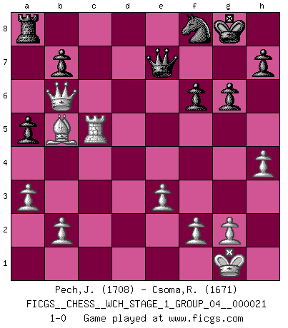 Last move : 1-0 2019 October 26 23:16:7 [Event "FICGS__CHESS__WCH_STAGE_1_GROUP_04__000021"] [Site "FICGS"] [Date "2019.07.01"] [Round "1"] [White "Pech,Jaroslav senior"] [Black "Csoma,Robert"] [Result "1-0"] [WhiteElo "1708"] [BlackElo "1671"] 1.d4 Nf6 2.c4 d5 3.Nc3 e6 4.Nf3 Be7 5.Bf4 O-O 6.e3 c5 7.dxc5 Bxc5 8.cxd5 Nxd5 9.Nxd5 exd5 10.a3 a5 11.Rc1 Be7 12.Bc7 Qd7 13.Be2 Na6 14.Bg3 Qe6 15.O-O Bd7 16.Qd4 Bf6 17.Be5 Bxe5 18.Nxe5 f6 19.Nxd7 Qxd7 20.Rfd1 Nc7 21.Qb6 Ne6 22.h4 g6 23.Bb5 Qe7 24.Rxd5 Rfd8 25.Rcd1 Rxd5 26.Rxd5 Nf8 27.Rc5 1-0 This chess game has been lost on time (started : 2019.07.01 23:47:45) Queen's pawn game Kingside Castling by player Black (move 5) Kingside Castling by player White (move 15) Player White won this chess game. Follow this game move after move (download)In the perfect Chess combination as in a first-rate short story, the whole plot and counter-plot should lead up to a striking finale, the interest not being allayed until the very last moment. (Yates and Winter) Es ist nicht das erste mal, dass sich die FIDE dem Arabischen Geld gebeugt hat (über die FIDE WM 2004 in Lybien). (Larry Evans) Por esta medida (el intervalo entre Fischer y sus contemporaneos), yo le considero el mas grande campeón mundial. (Garry Kasparov) Nous vivons dans un monde échiquéen : chaque jour qui passe est un défi à relever. (Philosophe Sasha) Tomorrow's what you make of it. (Horatio Caine, C.S.I. Miami)