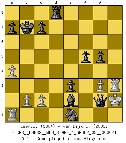 Last move : 0-1 2019 October 20 20:57:41 [Event "FICGS__CHESS__WCH_STAGE_1_GROUP_05__000021"] [Site "FICGS"] [Date "2019.07.01"] [Round "1"] [White "Eser,Ipekyilmaz"] [Black "van Dijk,Erik L."] [Result "0-1"] [WhiteElo "1804"] [BlackElo "2093"] 1.a3 g6 2.d3 Bg7 3.g3 d5 4.Bg2 e5 5.h3 Ne7 6.h4 Nbc6 7.Nh3 Bg4 8.f3 Be6 9.Bg5 h6 10.Bxe7 Qxe7 11.Nd2 f5 12.e3 O-O-O 13.a4 g5 14.hxg5 hxg5 15.Qe2 e4 16.fxe4 dxe4 17.d4 Bxd4 18.exd4 Nxd4 19.Qf2 e3 20.Bxb7+ Kxb7 21.Qg2+ Bd5 22.Nf3 Nxf3+ 23.Kf1 Bc4+ 24.Qe2 Bxe2+ 25.Kg2 Qe4 26.Rh2 Rxh3 27.Rxh3 Ne1+ 28.Kh2 Qg2+ 0-1 Anderssen's Opening Queenside Castling by player Black (move 12) Player Black won this chess game. Follow this game move after move (download)Many have become Chess Masters, no one has become the Master of Chess. (Siegbert Tarrasch) Die Idee von Capablanca, Schach als Fach in den Schulen zu lehren, ist großartig. (Fidel Castro) Sin errores no puede haber brillantez. (Emanuel Lasker) Il vaut toujours mieux jouer un plan faux de façon logique que de n'avoir pas de plan du tout. (Victor Kortchnoï) Humor is by far the most significant activity of the human brain. (Edward De Bono)