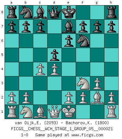 Last move : 1-0 2019 September 4 0:44:10 [Event "FICGS__CHESS__WCH_STAGE_1_GROUP_05__000021"] [Site "FICGS"] [Date "2019.07.01"] [Round "1"] [White "van Dijk,Erik L."] [Black "Bachorov,Kirill"] [Result "1-0"] [WhiteElo "2093"] [BlackElo "1800"] 1.d4 Nf6 2.c4 e6 3.g3 d5 4.Bg2 Be7 5.Nf3 1-0 This chess game has been lost on time (started : 2019.07.01 23:47:47) Catalan : Closed, 5.Nf3 Player White won this chess game. Follow this game move after move (download)If one piece is badly posted, the whole game is bad. (Tarrasch) Früher wurde jeder komplizierte Zug, jedes interessante Opfer mit großem Beifall und Enthusiasmus aufgenommen. Heute schaltet man einfach seinen Fritz an, und man kann sehen, was los ist, ob der Zug geht oder nicht. (Vladimir Kramnik) Aunque la mayoría de la gente disfruta observar las partidas de los grandes Maestros de ataque, algunos de los jugadores mas notables en la historia han sido los jugadores silenciosos posicionales. Lentamente ellos te aplastan despojandote de tu espacio, congestionando tus piezas y dejandote virtualmente sin nada que hacer. (Yasser Seirawan) 'L'échange des dames est un coup dur pour les deux adversaires...' Un journaliste lors d'une partie du match Spassky-Fischer The only difference between a tax man and a taxidermist is that the taxidermist leaves the skin. (Mark Twain)