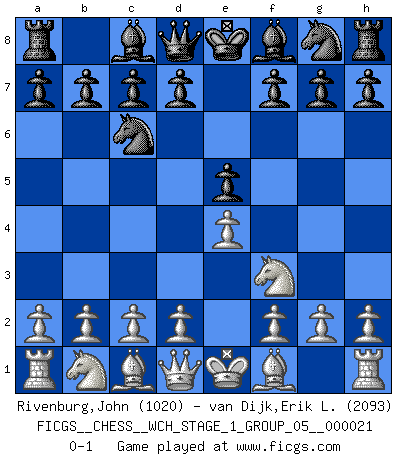 Last move : 0-1 2019 August 11 23:56:37 [Event "FICGS__CHESS__WCH_STAGE_1_GROUP_05__000021"] [Site "FICGS"] [Date "2019.07.01"] [Round "1"] [White "Rivenburg,John"] [Black "van Dijk,Erik L."] [Result "0-1"] [WhiteElo "1020"] [BlackElo "2093"] 1.e4 e5 2.Nf3 Nc6 0-1 This chess game has been lost on time (started : 2019.07.01 23:47:47) King's pawn game Player Black won this chess game. Follow this game move after move (download)In Chess, at least, the brave inherit the earth. (Edmar Mednis) Strategie ist, wie man ein Mädchen auf den Rücksitz bekommt. Taktik ist, was man tut, wenn man dann dort ist. (Anonymous) Una de estas pequeñas movidas modestas pudieran ser mas molestas a tu oponente que la amenaza mas grande. (Siegbert Tarrasch) Les Echecs, c'est l'art de la guerre sans les charniers, c'est la résurrection des morts tombés au champ d'honneur, l'espoir perpétuel, la suprématie de l'intelligence sur la force, la culture de l'esprit. (F. Szpiner) At work, the authority of a person is inversely proportional to the number of pens that person is carrying. (Dan Rotaru)