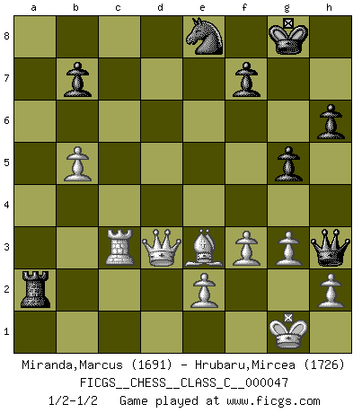 Last move : 1/2-1/2 2007 November 14 7:55:58 [Event "FICGS__CHESS__CLASS_C__000047"] [Site "FICGS"] [Date "2007.06.16"] [Round "1"] [White "Miranda,Marcus"] [Black "Hrubaru,Mircea"] [Result "1/2-1/2"] [WhiteElo "1691"] [BlackElo "1726"] 1.d4 e6 2.c4 Bb4+ 3.Bd2 a5 4.Nf3 d6 5.Nc3 Nf6 6.Qc2 Nc6 7.a3 Bxc3 8.Bxc3 Qe7 9.g3 e5 10.Bg2 O-O 11.d5 Nb8 12.b4 axb4 13.axb4 Rxa1+ 14.Bxa1 c6 15.dxc6 Nxc6 16.b5 Na5 17.c5 Qc7 18.O-O Be6 19.Qa4 Nc4 20.cxd6 Qxd6 21.Ng5 Bd5 22.Rd1 Qc5 23.Bxd5 Nxd5 24.Ne4 Qc8 25.Bxe5 Nde3 26.Rd3 Qf5 27.Bd4 Qxe4 28.Bxe3 Rc8 29.Qd1 h6 30.Rc3 Re8 31.Bc1 Ra8 32.f3 Qe6 33.Qd4 Nd6 34.Qd3 Ra2 35.Bf4 Ne8 36.Kf2 g5 37.Be3 Qh3 38.Kg1 1/2-1/2 Queen's pawn : Franco-Indian (Keres) defense Kingside Castling by player Black (move 10) Kingside Castling by player White (move 18) This chess game ended in a draw. Follow this game move after move (download)At this time Fischer is simply a level above all the best Chessplayers in the world. (John Jacobs) Gott hat gewollt, dass ich Champion werde. (Surab Azmajparaschvili) Aquellos que dicen entender al Ajedrez, no entienden nada. (Robert Hubner) Des idées, des idées, j'en ai cent, j'en ai mille. Des bonnes, des mauvaises, applicables, irréalisables... Il suffit de faire le tri ! (Roos) Whatever you do, don't be bored. This is absolutely the most exciting time we could have possibly hoped to be alive. And things are just starting. (From movie Waking life)