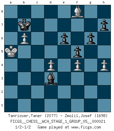 Last move : 1/2-1/2 2019 December 15 21:37:12 [Event "FICGS__CHESS__WCH_STAGE_1_GROUP_05__000021"] [Site "FICGS"] [Date "2019.07.01"] [Round "1"] [White "Tanriover,Taner"] [Black "Zmolil,Josef"] [Result "1/2-1/2"] [WhiteElo "2077"] [BlackElo "1698"] 1.e4 c5 2.Nc3 Nc6 3.f4 g6 4.Nf3 Bg7 5.Bb5 Nd4 6.Nxd4 cxd4 7.Ne2 Nf6 8.e5 Nd5 9.c3 O-O 10.Qb3 Nc7 11.Nxd4 d6 12.Nf3 Nxb5 13.Qxb5 dxe5 14.Nxe5 a6 15.Qd3 Qxd3 16.Nxd3 Bf5 17.Nf2 b5 18.a3 a5 19.Ke2 Be6 20.d3 Bd5 21.Rg1 b4 22.axb4 axb4 23.Rxa8 Rxa8 24.Bd2 Ra2 25.Nd1 Bc6 26.cxb4 Bd4 27.Be3 Bxb2 28.Nxb2 Rxb2+ 29.Bd2 Rb3 30.Rc1 Bxg2 31.Bc3 f6 32.Kd2 Ra3 33.Bd4 Kf7 34.b5 Ra2+ 35.Ke3 Ke6 36.b6 Ra5 37.Bc5 Ba8 38.Kd4 Kd7 39.Kc4 Bc6 40.Re1 e6 41.Rb1 Ra4+ 42.Rb4 Bd5+ 43.Kc3 Rxb4 44.Kxb4 Kc6 45.Be3 Bg2 46.Ka5 Kb7 47.h4 Bf1 48.d4 Bd3 49.Bd2 Kc6 50.Bb4 Be2 51.Be7 f5 52.Ba3 Kb7 53.Bf8 Bf1 54.Be7 Bd3 55.Bf8 1/2-1/2 Sicilian : Grand Prix attack Kingside Castling by player Black (move 9) This chess game ended in a draw. Follow this game move after move (download)Chess is everything: art, science and sport. (Anatoly Karpov) Im Leben werden Partien nie so unstrittig gewonnen wie im Spiel (Emanuel Lasker) Te sientas frente a un tablero y repentinamente tu corazón brinca. Tu mano tiembla al tomar una pieza y moverla. Pero lo que el Ajedrez te enseña es que tu debes permanecer ahí con calma y pensar de que si realmente es una buena idea o de que si hay otras ideas mejores. (Stanley Kubrick) L'action d'une oeuvre littéraire se déroule sur un champ de bataille. Les masques et les types du drame moderne correspondent aux pièces du jeu d'échecs. L'intrigue correspond aux coups et aux gambits, c'est à dire aux techniques du jeu telles qu'utilisées et interprétées par les joueurs. Les tactiques et les péripéties [mouvements] correspondent aux coups exécutés par l'adversaire. (Viktor Shklovsky) Somewhere in the world there is an epigram for every dilemma. (Hendrik Willem van Loon)