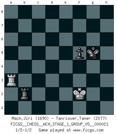 Last move : 1/2-1/2 2019 December 24 14:51:13 [Event "FICGS__CHESS__WCH_STAGE_1_GROUP_05__000021"] [Site "FICGS"] [Date "2019.07.01"] [Round "1"] [White "Mach,Jiri"] [Black "Tanriover,Taner"] [Result "1/2-1/2"] [WhiteElo "1690"] [BlackElo "2077"] 1.e4 e5 2.Nf3 Nc6 3.Bb5 a6 4.Ba4 Nf6 5.O-O Be7 6.Re1 b5 7.Bb3 O-O 8.c3 d5 9.exd5 Nxd5 10.Nxe5 Nxe5 11.Rxe5 c6 12.d4 Bd6 13.Re1 Qh4 14.g3 Qh3 15.Be3 Be6 16.Qf3 a5 17.Qg2 Qf5 18.Bd1 b4 19.c4 Nxe3 20.fxe3 Bxc4 21.Nd2 Bb5 22.Rc1 Rac8 23.Qf3 Qe6 24.Bb3 Qd7 25.Ne4 Be7 26.Nc5 Qa7 27.Bd1 Rfe8 28.Be2 Bxe2 29.Rxe2 Bxc5 30.Rxc5 Re6 31.Kg2 h6 32.Rec2 Rce8 33.Rxc6 Rxe3 34.Rc7 Rxf3 35.Rxa7 Rd3 36.Rxa5 Rxd4 37.a4 b3 38.Rf2 f6 39.Ra7 Re5 40.h4 Rd3 41.Kh2 h5 42.Rb7 Kh7 43.Rb4 Kg6 44.g4 Rc5 45.gxh5+ Kxh5 46.Rg2 Rc2 47.Rb7 Rxg2+ 48.Kxg2 Kxh4 49.Rxg7 Rd2+ 50.Kf3 Rxb2 51.Rb7 Kg5 52.a5 Ra2 53.Rxb3 Rxa5 54.Kg2 Ra2+ 55.Kf3 Rc2 56.Kg3 Ra2 57.Re3 Rb2 58.Kf3 f5 59.Ra3 Rb4 60.Kf2 Rb2+ 1/2-1/2 Ruy Lopez : Closed, 7...O-O Kingside Castling by player White (move 5) Kingside Castling by player Black (move 7) 10 pieces endgame at move 48 : White KRPPP , Black KRPPP WHITE : King + 1 Rook 3 Pawns BLACK : King + 1 Rook 3 Pawns 9 pieces endgame at move 48 : White KRPP , Black KRPPP WHITE : King + 1 Rook 2 Pawns BLACK : King + 1 Rook 3 Pawns 8 pieces endgame at move 49 : White KRPP , Black KRPP WHITE : King + 1 Rook 2 Pawns BLACK : King + 1 Rook 2 Pawns 7 pieces endgame at move 50 : White KRP , Black KRPP WHITE : King + 1 Rook 1 Pawn BLACK : King + 1 Rook 2 Pawns 6 pieces endgame at move 53 : White KRP , Black KRP WHITE : King + 1 Rook 1 Pawn BLACK : King + 1 Rook 1 Pawn 5 pieces endgame at move 53 : White KR , Black KRP WHITE : King + 1 Rook BLACK : King + 1 Rook 1 Pawn This chess game ended in a draw. Follow this game move after move (download)Good positions don't win games, good moves do. (Gerald Abrahams) Es hat in meinem Leben Zeiten gegeben, da ich sehr nahe daran war zu glauben, daß ich auch nicht eine einzige Schachpartie verlieren könnte. (José Raúl Capablanca) Mis oponentes también hacen buenas movidas. A veces yo no tomo esas cosas en consideración. (Bobby Fischer) Le jeu d'échecs est comme rejeté hors du temps. (Antoine de Saint-Exupéry) When you've done things right people won't know you've done anything at all. (Futurama)