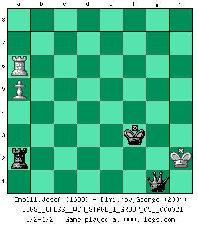 Last move : 1/2-1/2 2019 December 14 15:5:19 [Event "FICGS__CHESS__WCH_STAGE_1_GROUP_05__000021"] [Site "FICGS"] [Date "2019.07.01"] [Round "1"] [White "Zmolil,Josef"] [Black "Dimitrov,George"] [Result "1/2-1/2"] [WhiteElo "1698"] [BlackElo "2004"] 1.d4 Nf6 2.c4 g6 3.Nc3 d5 4.cxd5 Nxd5 5.e4 Nxc3 6.bxc3 Bg7 7.Bc4 c5 8.Ne2 Nc6 9.Be3 O-O 10.O-O Bg4 11.f3 Bd7 12.Rb1 Qc7 13.dxc5 Rfd8 14.Bb3 Na5 15.Qc2 e6 16.c4 Be8 17.Kh1 Nc6 18.Ba4 Nd4 19.Nxd4 Bxa4 20.Qxa4 Bxd4 21.Bxd4 Rxd4 22.Qb5 Rad8 23.Qxb7 Qxc5 24.Rfc1 Rd2 25.a4 a6 26.Qb3 R8d3 27.Qb8+ Kg7 28.h3 g5 29.Qg3 h6 30.h4 Kg6 31.Qh3 Qf2 32.Rg1 gxh4 33.Qg4+ Kh7 34.Qf4 Rd7 35.Kh2 Rc2 36.Rbc1 Rxc1 37.Rxc1 f5 38.Rg1 Rg7 39.Kh1 Qg3 40.Qxg3 hxg3 41.exf5 exf5 42.c5 Kg6 43.Rc1 Kf6 44.Kg1 Ke5 45.Kf1 h5 46.c6 Kd6 47.Rc4 Rc7 48.Rf4 Rf7 49.Rc4 f4 50.Ke2 h4 51.c7 Rxc7 52.Rxf4 Rc2+ 53.Ke3 Rxg2 54.Rxh4 Ra2 55.Rh6+ Ke5 56.Rxa6 Ra3+ 57.Ke2 g2 58.Kf2 Ra2+ 59.Kg1 Kf4 60.Kh2 Kxf3 61.a5 g1Q+ 1/2-1/2 King's Indian defense, 3.Nc3 Kingside Castling by player Black (move 9) Kingside Castling by player White (move 10) 10 pieces endgame at move 52 : White KRPPP , Black KRPPP WHITE : King + 1 Rook 3 Pawns BLACK : King + 1 Rook 3 Pawns 9 pieces endgame at move 53 : White KRPP , Black KRPPP WHITE : King + 1 Rook 2 Pawns BLACK : King + 1 Rook 3 Pawns 8 pieces endgame at move 54 : White KRPP , Black KRPP WHITE : King + 1 Rook 2 Pawns BLACK : King + 1 Rook 2 Pawns 7 pieces endgame at move 56 : White KRPP , Black KRP WHITE : King + 1 Rook 2 Pawns BLACK : King + 1 Rook 1 Pawn 6 pieces endgame at move 60 : White KRP , Black KRP WHITE : King + 1 Rook 1 Pawn BLACK : King + 1 Rook 1 Pawn Promotion Queen by player Black (move 61) This chess game ended in a draw. Follow this game move after move (download)Chess mastery essentially consists of analyzing Chess positions accurately. (Mikhail Botvinnik) Ich war zu klein für die Schach-Schülermannschaft! (Woody Allen) El Ajedrez es el juego mas altamente simbólico, pero las agresiones estan por lo tanto aún mas francamente representadas en la partida. Tal vez comenzo como un juego de guerra; Algo como la representación de una batalla en miniatura entre las fuerzas de dos reinos. (Karl Meninger) Toutes les manuvres exécutées sur une colonne ouverte ont pour but ultime l'intrusion définitive sur la septième ou la huitième rangée, en plein cur de la position ennemie. (Aaron Nimzovitch) You can't play chess if you're groggy from pills. (Anatoly Karpov)