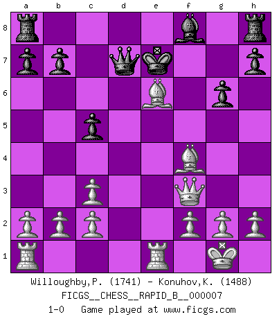 Last move : 1-0 2006 July 23 20:43:7 [Event "FICGS__CHESS__RAPID_B__000007"] [Site "FICGS"] [Date "2006.06.14"] [Round "1"] [White "Willoughby,Peter"] [Black "Konuhov,Konstantin"] [Result "1-0"] [WhiteElo "1741"] [BlackElo "1488"] 1.e4 c5 2.Nf3 Nf6 3.e5 Nd5 4.Nc3 Nxc3 5.dxc3 Nc6 6.Bc4 d6 7.exd6 exd6 8.O-O Be6 9.Re1 Qd7 10.Ng5 Nd8 11.Qh5 g6 12.Qe2 Ke7 13.Qf3 d5 14.Nxf7 Nxf7 15.Bxd5 Ng5 16.Bxg5+ Kd6 17.Bf4+ Ke7 18.Bxe6 1-0 Sicilian : Nimzovich-Rubinstein variation Kingside Castling by player White (move 8) Player White won this chess game. Follow this game move after move (download)The passed Pawn is a criminal, who should be kept under lock and key. Mild measures, such as police surveillance, are not sufficient. (Aaron Nimzovich) Die Idee von Capablanca, Schach als Fach in den Schulen zu lehren, ist großartig. (Fidel Castro) Haz el enroque temprano y seguido. (Rob Sillars) Le joueur d'Echecs qui veut atteindre le top est obligé de développer son propre credo créatif. Alexeï Stepanovicth Souétine. Il est facile d'écrire des livres ! Ce qui est difficile, c'est de jouer ! (Alexeï Stepanovicth Souétine) Watch your thoughts; they become words. Watch your words; they become actions. Watch your actions; they become habits. Watch your habits; they become character. Watch your character; it becomes your destiny. (Frank Outlaw)