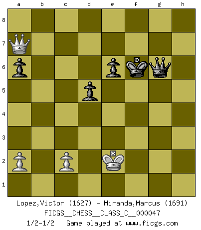 Last move : 1/2-1/2 2008 January 23 21:29:46 [Event "FICGS__CHESS__CLASS_C__000047"] [Site "FICGS"] [Date "2007.06.16"] [Round "1"] [White "Lopez,Victor"] [Black "Miranda,Marcus"] [Result "1/2-1/2"] [WhiteElo "1627"] [BlackElo "1691"] 1.e4 e5 2.Nf3 Nc6 3.Bc4 Nf6 4.d4 exd4 5.e5 d5 6.Bb5 Ne4 7.Nxd4 Bd7 8.Bxc6 bxc6 9.O-O Bc5 10.f3 Ng5 11.Be3 O-O 12.f4 Ne6 13.f5 Nxd4 14.Bxd4 Bxd4+ 15.Qxd4 Qg5 16.h4 Qh5 17.Qf4 g6 18.e6 fxe6 19.Qxc7 Rf7 20.fxg6 Rxf1+ 21.Kxf1 Qd1+ 22.Kf2 Rf8+ 23.Kg3 Qe1+ 24.Kh3 Rf1 25.Qd8+ Kg7 26.Nd2 Rh1+ 27.Kg4 Qe2+ 28.Kg3 Qe5+ 29.Kf2 Rxa1 30.Qxd7+ Kxg6 31.Nf3 Qf6 32.h5+ Kh6 33.g4 Rf1+ 34.Kxf1 Qxf3+ 35.Ke1 Qe4+ 36.Kf2 Kg5 37.Qxc6 Qd4+ 38.Kf1 Qxb2 39.Qc5 Qc1+ 40.Ke2 Kxg4 41.h6 a6 42.Qd4+ Qf4 43.Qg7+ Kh5 44.Qxh7 Qxh6 45.Qd3 Qg6 46.Qh3+ Kg5 47.Qg3+ Kh6 48.Qe3+ Kg7 49.Qa7+ Kf6 1/2-1/2 Two knights defense Kingside Castling by player White (move 9) Kingside Castling by player Black (move 11) 10 pieces endgame at move 44 : White KQPPP , Black KQPPP WHITE : King + 1 Queen 3 Pawns BLACK : King + 1 Queen 3 Pawns 9 pieces endgame at move 44 : White KQPP , Black KQPPP WHITE : King + 1 Queen 2 Pawns BLACK : King + 1 Queen 3 Pawns This chess game ended in a draw. Follow this game move after move (download)It is not enough to be a good player... you must also play well. (Siegbert Tarrasch) Es ist wirklich schade, dass so viele Schachspieler nicht auf ihr Äußeres achten! (Alexandra Kosteniuk) Ser exitoso en el Ajedrez te permite descubrir tu propia personalidad. Eso es lo que deseo para los niños de mi clase. (Saudin Robovic) Les échecs c'est le défi de l'alpiniste, toujours plus haut, prêt à tout pour monter à l'assaut du Roi ennemi. Les échecs, c'est de la musique en mouvement, un ballet majestueux pour les yeux. C'est de la poésie composée par les fantômes du passé qui au même titre que Rimbaud ou Verlaine méritent notre admiration. Les échecs, c'est de la peinture ou le moindre mouvement modifie le tableau pour en faire un Picasso ou un Van Gogh. Les échecs, c'est tout et rien, c'est la vie et la mort. Jjulie33 sur le forum de France-Echecs. Don't be irreplaceable, if you can't be replaced, you can't be promoted. (Dan Rotaru)