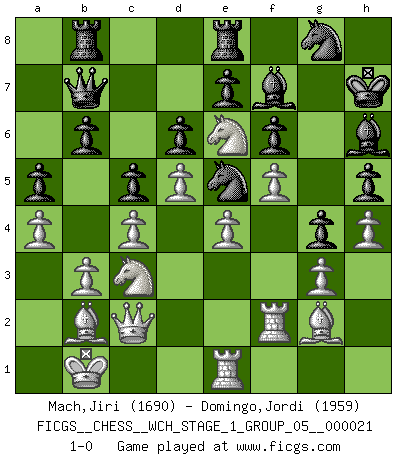 Last move : 1-0 2019 October 31 14:1:9 [Event "FICGS__CHESS__WCH_STAGE_1_GROUP_05__000021"] [Site "FICGS"] [Date "2019.07.01"] [Round "1"] [White "Mach,Jiri"] [Black "Domingo,Jordi"] [Result "1-0"] [WhiteElo "1690"] [BlackElo "1959"] 1.c4 g5 2.d4 h6 3.e4 Bg7 4.h4 g4 5.Nc3 Nc6 6.Be3 d6 7.Nge2 h5 8.Qc2 Bd7 9.O-O-O b6 10.Kb1 Na5 11.b3 c5 12.f4 Nc6 13.g3 a5 14.Bg2 Nh6 15.Qb2 Qc8 16.Rhe1 Qb7 17.Rd2 O-O 18.f5 Kh7 19.a4 Ng8 20.d5 Ne5 21.Qc2 Be8 22.Bg5 f6 23.Be3 Bh6 24.Nf4 Bf7 25.Rf2 Rab8 26.Qd2 Rfc8 27.Rc1 Re8 28.R2f1 Rec8 29.Rce1 Re8 30.Qc2 Rec8 31.Bc1 Re8 32.Bb2 Rec8 33.Ne6 Re8 34.Rf2 1-0 English Opening Queenside Castling by player White (move 9) Kingside Castling by player Black (move 17) Player White won this chess game. Follow this game move after move (download)When in doubt... play Chess ! (Tevis) Schach wird sich dank seiner hohen kulturellen Tradition immer durchsetzen. In näherer Zukunft womöglich sogar als Gegenreaktion auf die maßlose Reizüberflutung im Freizeit- und Spielbereich. (Garry Kasparov) El Ajedrez es tortura mental. (Garry Kasparov) Les échecs sont plus proches de l'art de l'assassinat que de l'art de la guerre. (Arturo Perez-Reverte) In fact if nothing is done against this teddy bear, hereby I announce that I would quit chess, rapid chess, blitz chess, postal chess, email chess, server chess and correspondence chess I will then switch to a table game where teddy bears aren't going to be seen for a while, like Poker, or Roulette, all 18+ games. (Elmer Valderrama)