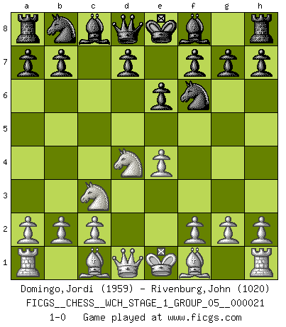Last move : 1-0 2019 August 10 9:10:0 [Event "FICGS__CHESS__WCH_STAGE_1_GROUP_05__000021"] [Site "FICGS"] [Date "2019.07.01"] [Round "1"] [White "Domingo,Jordi"] [Black "Rivenburg,John"] [Result "1-0"] [WhiteElo "1959"] [BlackElo "1020"] 1.e4 c5 2.Nf3 e6 3.d4 cxd4 4.Nxd4 Nf6 5.Nc3 1-0 This chess game has been lost on time (started : 2019.07.01 23:47:47) Sicilian : Anderssen variation Player White won this chess game. Follow this game move after move (download)A man without frontiers. He didn't divide the East and the West, he brought them together in their admiration for him. (Ljubomir Ljubojevic, about Bobby Fischer's death) Warum muß ich gegen diesen IDIOTEN verlieren? (Aaron Nimzowitsch) La vida es como el Ajedrez, con lucha, competición y eventos buenos y malos. (Benjamin Franklin) On entre au jeu d'Echecs comme on entre en Religion. Pour le joueur d'Echecs, la partie d'Echecs c'est l'office, la messe, le défilé du 1er Mai, le dépôt de gerbe au Monument aux Morts. C'est un drame sacré. (Michel Roos) If we knew what we were doing, we would not call it research. (Albert Einstein)