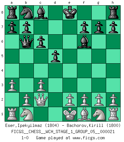 Last move : 1-0 2019 September 2 11:7:23 [Event "FICGS__CHESS__WCH_STAGE_1_GROUP_05__000021"] [Site "FICGS"] [Date "2019.07.01"] [Round "1"] [White "Eser,Ipekyilmaz"] [Black "Bachorov,Kirill"] [Result "1-0"] [WhiteElo "1804"] [BlackElo "1800"] 1.a3 e5 2.d3 d5 3.d4 exd4 4.Qxd4 Nf6 5.Bg5 Be7 6.Bxf6 Bxf6 7.Qd3 c6 8.c3 Qb6 9.Qc2 1-0 This chess game has been lost on time (started : 2019.07.01 23:47:47) Anderssen's Opening Player White won this chess game. Follow this game move after move (download)Chess is thirty to forty percent psychology. You don't have this when you play a computer. I can't confuse it. (Judith Polgar) Mein Name ist Rustam Kamsky. Sie haben meinen Sohn belästigt. Bereiten Sie sich aufs Sterben vor. (Rustam Kamsky) A la fecha, Fischer esta simplemente un nivel arriba de todos los mejores jugadores de Ajedrez del mundo. (John Jacobs) Toute estimation doit être constamment réévaluée. (Jacob Estrin) . 'gn is not allowed in chess unless n is an integer between 1 and 8 inclusive, where 1 and 8 are to interpreted as the standard numerals standing for integers in the ordered real-closed field R, with the *canonical* ordering. (As opposed to, say, an integer in the domain Z[2+i*sqrt(5)] or an integer in some exotic Grothendieck topos). (Normajean Yates)