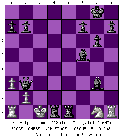 Last move : 0-1 2019 October 18 14:28:28 [Event "FICGS__CHESS__WCH_STAGE_1_GROUP_05__000021"] [Site "FICGS"] [Date "2019.07.01"] [Round "1"] [White "Eser,Ipekyilmaz"] [Black "Mach,Jiri"] [Result "0-1"] [WhiteElo "1804"] [BlackElo "1690"] 1.a3 e5 2.d3 d5 3.d4 exd4 4.Qxd4 Nf6 5.Bg5 Be7 6.Bxf6 Bxf6 7.Qd3 O-O 8.c3 g6 9.h3 c5 10.h4 Bf5 11.Qb5 d4 12.cxd4 Nc6 13.e3 Re8 14.Be2 cxd4 15.Nd2 dxe3 16.Ndf3 Nd4 17.Nxd4 Qxd4 18.fxe3 Qxe3 19.Qb4 Re4 20.Qd2 Bxh4+ 21.g3 Bxg3+ 22.Kd1 Qb3+ 23.Qc2 Rd8+ 24.Bd3 Rxd3+ 25.Kc1 Re1+ 26.Qd1 R3xd1+ 0-1 Anderssen's Opening Kingside Castling by player Black (move 7) Player Black won this chess game. Follow this game move after move (download)You can only get good at Chess if you love the game. (Bobby Fischer) Im Schach gewinnt jeder. Hat man Freunde am Spiel - und das ist die Hauptsache - ist auch der Verlust einer Partie kein Unglück. (David Bronstein) Aún deseo matar a Fischer. (Boris Spassky) Le succès, c'est être capable d'aller d'échec en échec sans perdre son enthousiasme. (Winston Churchill) Art is not a thing, it is a way. (Elbert Hubbard)
