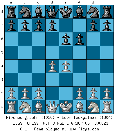 Last move : 0-1 2019 August 16 4:3:16 [Event "FICGS__CHESS__WCH_STAGE_1_GROUP_05__000021"] [Site "FICGS"] [Date "2019.07.01"] [Round "1"] [White "Rivenburg,John"] [Black "Eser,Ipekyilmaz"] [Result "0-1"] [WhiteElo "1020"] [BlackElo "1804"] 1.e4 f6 2.d4 e6 0-1 This chess game has been lost on time (started : 2019.07.01 23:47:47) Barnes defense Player Black won this chess game. Follow this game move after move (download)I had a toothache during the first game. In the second game I had a headache. In the third game it was an attack of rheumatism. In the fourth game, I wasn't feeling well. And in the fifth game? Well, must one have to win every game ? (Siegbert Tarrasch) Wenn Du absolut nicht mehr weißt, was Du tun sollst, dann ist es Zeit für Panik. (John van der Wiel) El Ajedrez no es como la vida... ¡tiene reglas!. (Mark Pasternak) Des combinaisons [dans le jeu d'échecs] pareilles à des mélodies. Je crois entendre pour ainsi dire la musique des coups... (Vladimir Nabokov) There is no vagueness without wind. (Chinese proverb)
